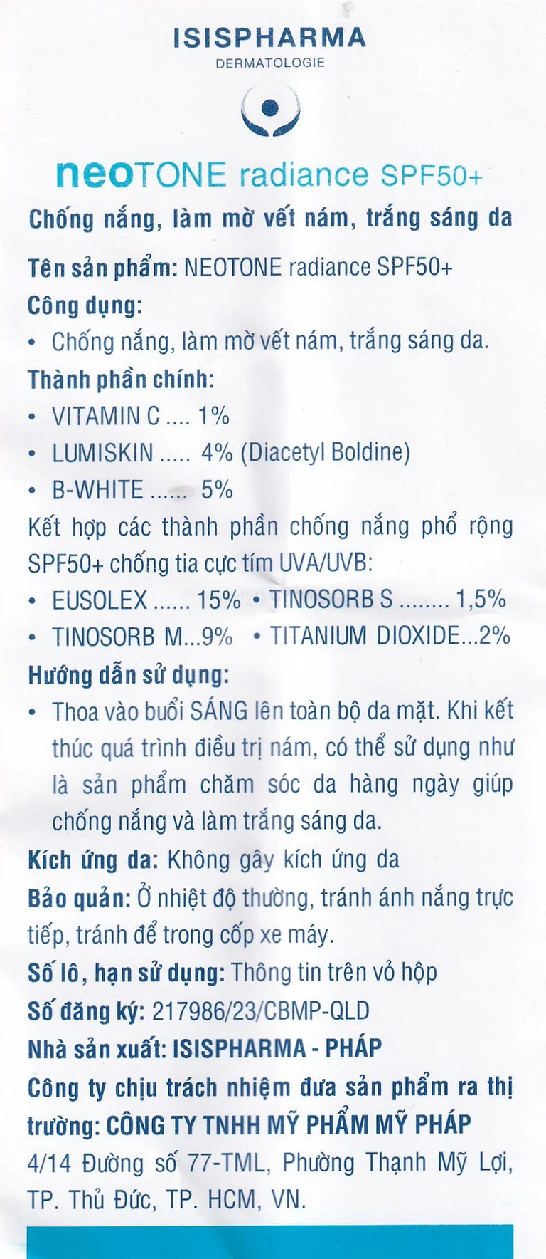 Kem chống nắng Isis Pharma NeoTone Radiance SPF 50+ là sản phẩm chăm sóc da hàng ngày giúp chống nắng và hỗ trợ dưỡng da trắng sáng. Sản phẩm không chứa paraben, không chứa phenoxyethanol, không có mùi, không gây mụn, không gây dị ứng, không gây nhờn dính, phù hợp với mọi loại da, an toàn ngay cả với da nhạy cảm.