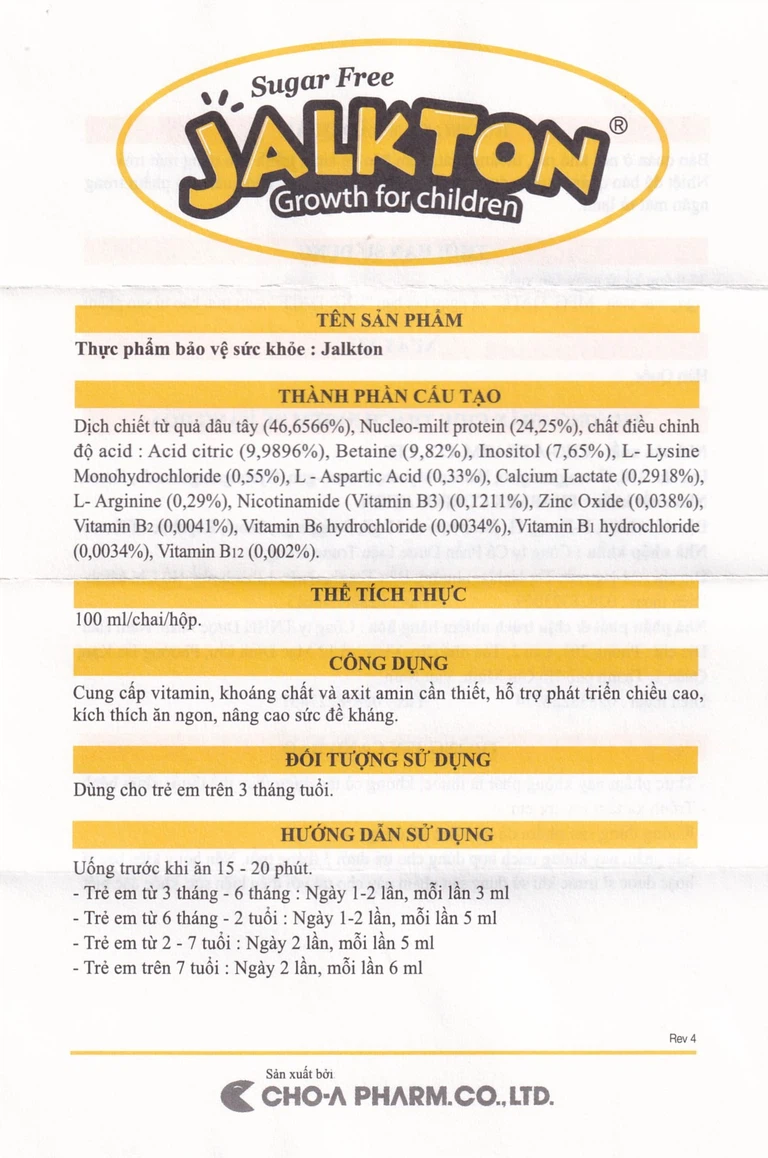 Siro Jalkton kết hợp đa dạng các vitamin, acid amin và khoáng chất giúp trẻ tăng sức đề kháng, phát triển chiều cao. Sản phẩm được nhập khẩu trực tiếp từ Hàn Quốc, là sản phẩm danh tiếng của Cho-A Pharm – đối tác dinh dưỡng của câu lạc bộ bóng đá Manchester United (Anh). Jalkton có vị ngọt nhẹ, chiết xuất từ cỏ ngọt tự nhiên, hương dâu tây và không chứa đường độc hại, rất tốt cho khẩu vị và sức khỏe của bé.