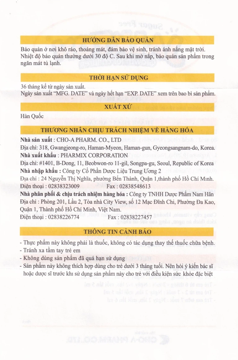 Cho-A Pharmlà công ty dược phẩm của Hàn Quốc. Theo đuổi một thế giới không còn bệnh tật và nâng cao chất lượng cuộc sống cho con người, Cho-A đã cống hiến hết mình cho sự phát triển của các sản phẩm chất lượng cao. Tất cả hệ thống sản xuất và kiểm soát chất lượng của ChoA đều được Chính phủ Hàn Quốc phê duyệt Thực hành Sản xuất Tốt (KGMP). Hơn nữa, Cho-A đã nỗ lực thúc đẩy sản xuất, nâng cao chất lượng sản xuất thông qua đầu tư liên tục vào quy trình sản xuất của mình. Cho-A mở rộng bán hàng của mình cả ở thị trường thuốc và thị trường nước ngoài liên tục và sẵn sàng phục vụ các sản phẩm chất lượng cao cho khắp nơi trên thế giới.