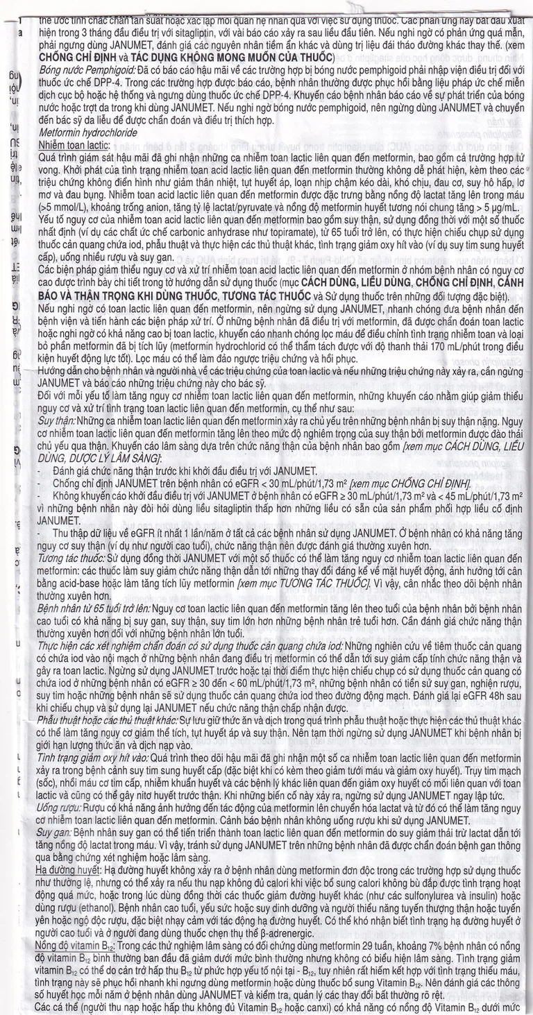 Giám sát chức năng thận: Metformin và sitagliptin được đào thải chủ yếu qua thận. Nguy cơ tích lũy metformin và nhiễm toan lactic tăng theo mức độ suy thận. Chống chỉ định dùng Janumet ở bệnh nhân suy thận nặng, có eGFR < 30mL/phút/1,73m2.