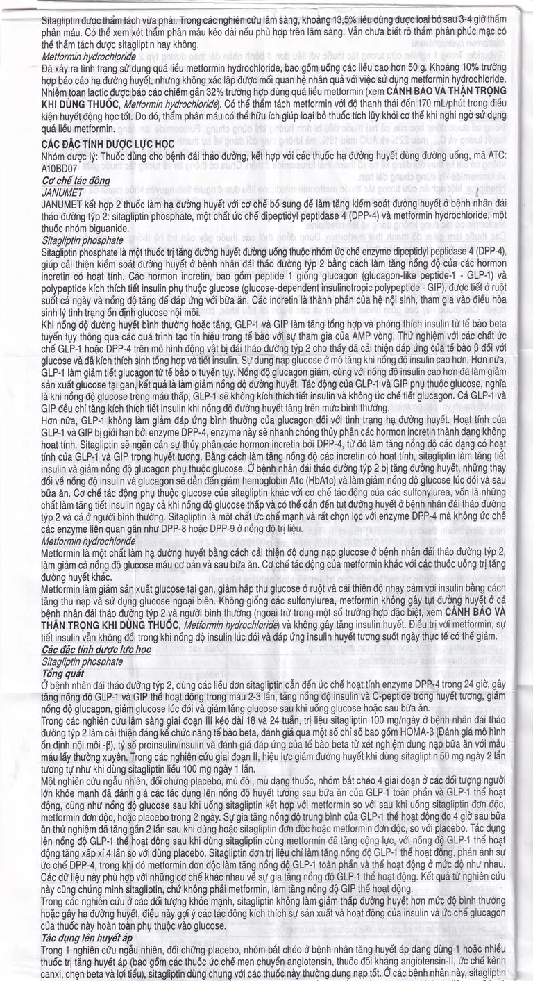 Janumet kết hợp 2 thuốc làm hạ đường huyết với cơ chế bổ sung để làm tăng kiểm soát đường huyết ở bệnh nhân đái tháo đường type 2: Sitagliptin phosphate (thuốc nhóm ức chế dipeptidyl peptidase 4 (DPP-4)) và metformin hydrochloride (thuốc nhóm biguanide).