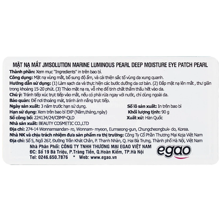 Đồng thời, JMsolution Marine Luminous Pearl Deep Moisture Eye Patch cũng chứa nhiều thành phần giúp cải thiện nếp nhăn, đồng thời giúp vùng da quanh mắt trở nên khỏe mạnh và mịn màng hơn.
