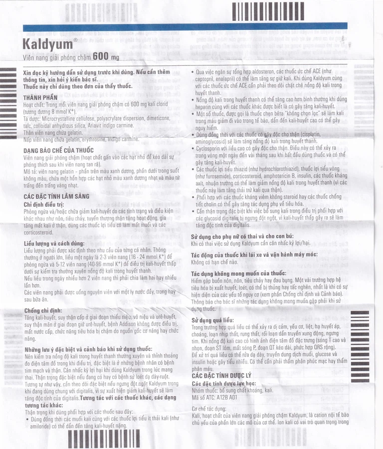 Do đó, khi dùng Kaldyum 600Mg cùng với các thuốc trên cần theo dõi chặt chẽ nồng độ kali trong huyết thanh.