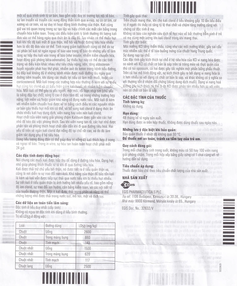 Kali clorid được hấp thu dễ dàng ở đường tiêu hóa. Hoạt chất của viên nang giải phóng chậm Kaldyum được gắn vào các hạt nhỏ để kéo dài việc phóng thích. Sau khi viên nang tan rã, các hạt nhỏ được phân tán và phóng thích hoạt chất dần dần khi đi qua đường tiêu hóa. Hai yếu tố trên sẽ ngăn kali clorid đạt nồng độ tại chỗ rất cao và do đó làm giảm tác dụng phụ ở hệ tiêu hóa.