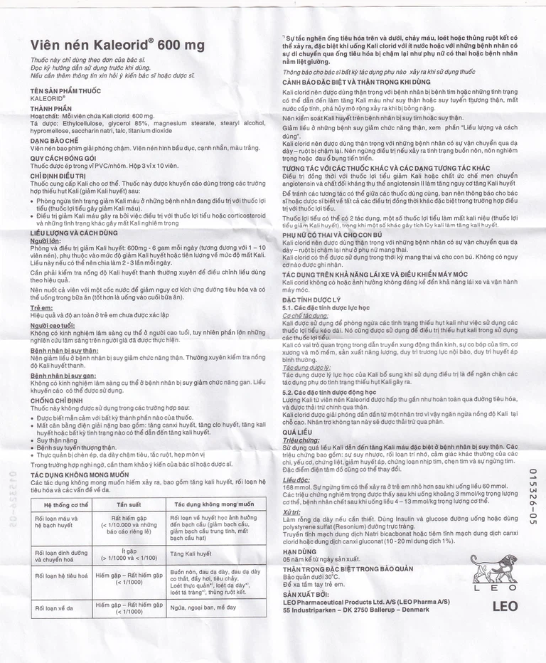 Viên nén Kaleorid 600mg LEO phòng ngừa và điều trị giảm kali huyết (3 vỉ x 10 viên)