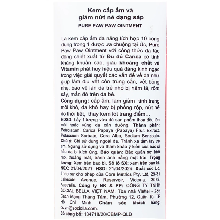 Kem dưỡng ẩm Pure Paw Paw được làm từ 100% đu đủ tươi lên men có khả năng kháng khuẩn, giàu vitamin và khoáng chất. Sản phẩm nói không với các thành phần có hại, không chứa chất nền, không hương tổng hợp, không parabens, sulphates. Sản phẩm kem dưỡng ẩm Pure Paw Paw trở thành kem dưỡng đa năng, có thể chữa lành mọi vấn đề về da và ở mọi vùng da từ môi, da tay, da chân, da mặt,… Và còn dùng được cho mọi độ tuổi, mọi loại da, kể cả làn da nhạy cảm hay da em bé.