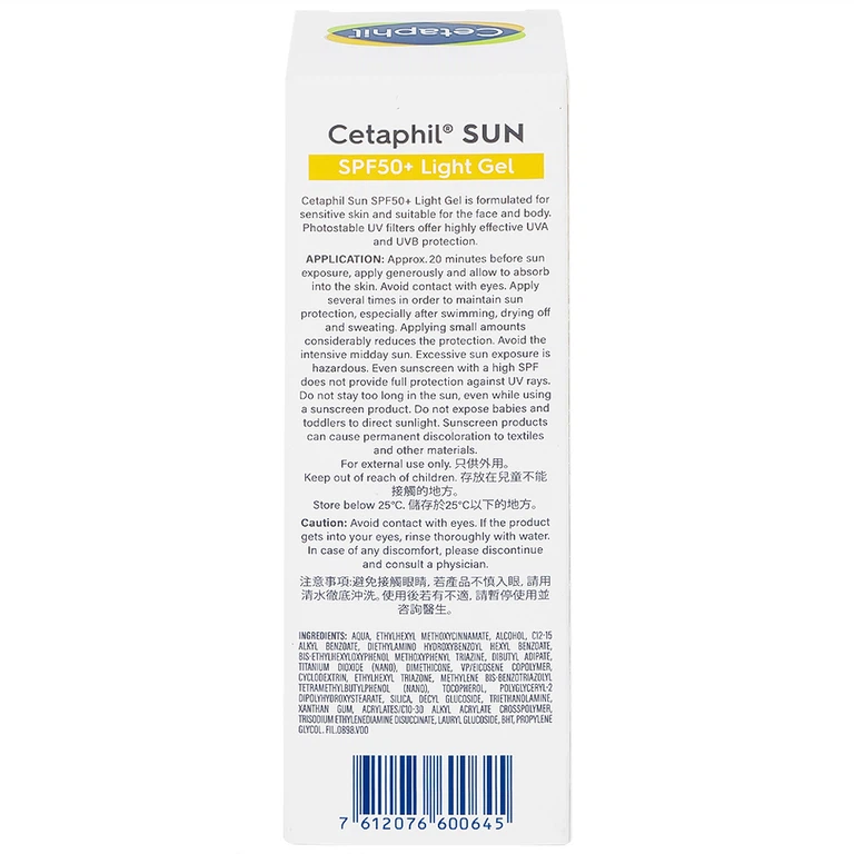 Cetaphil Sun SPF 50+ Light Gel là sản phẩm chống nắng thể gel thích hợp cho da nhạy cảm đến từ thương hiệu Cetaphil – Canada. Với màng lọc vật lý thiết kế nano Titanium Dioxide 400, Cetaphil Sun SPF 50+ Light Gel giúp bảo vệ là da tối ưu và bền vững khỏi các tia UVA/UVB, đồng thời kết hợp thành phần vitamin E tinh khiết giúp dưỡng da dịu lành nhờ khả năng dưỡng ẩm, sáng da, ngăn ngừa lão hóa.