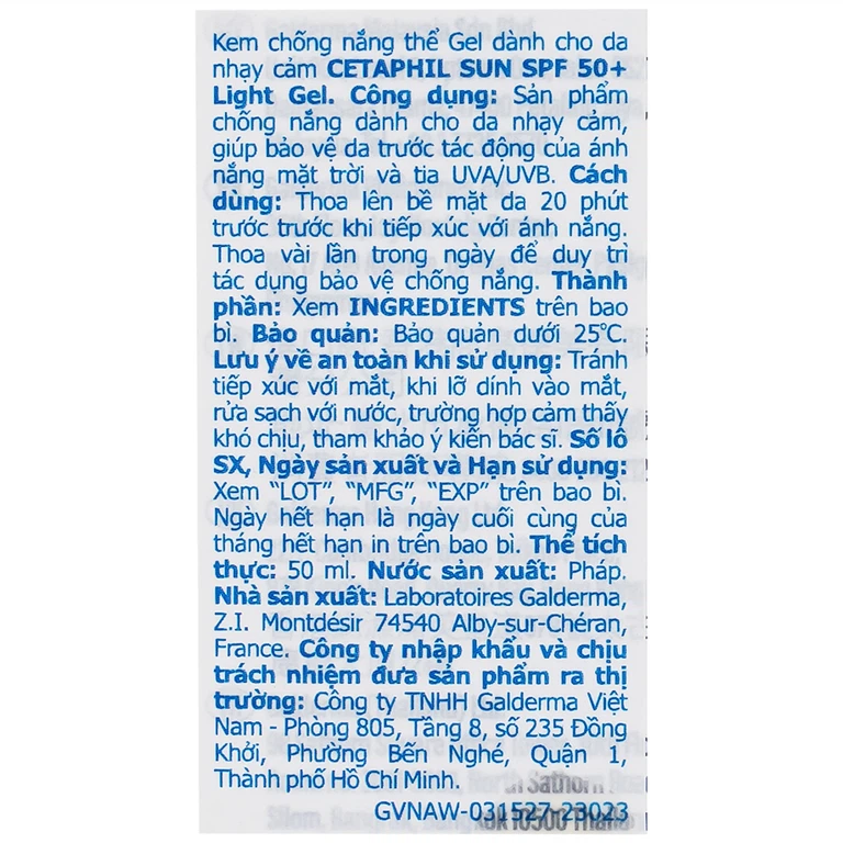 Kem chống nắng Cetaphil Sun SPF 50+ Light Gel có chất gel mỏng nhẹ, thẩm thấu nhanh và công thức lành tính không chứa dầu khoáng, không paraben, không hương liệu, không màu, không mùi. Sản phẩm được bác sĩ da liễu Mỹ khuyên dùng cho da nhạy cảm.