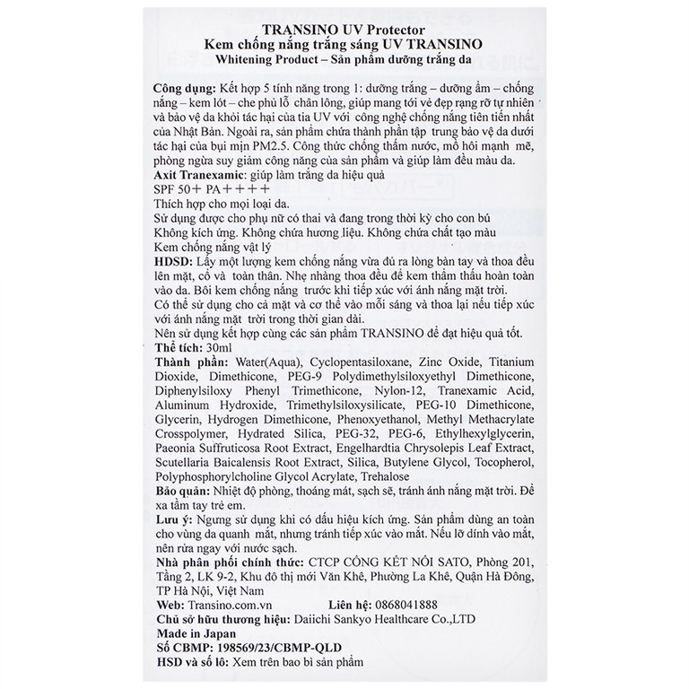 Kem chống nắng trắng sáng Transino UV Protector (30ml) là sản phẩm kết hợp 5 tính năng trong 1: Dưỡng trắng – dưỡng ẩm – chống nắng – kem lót – che phủ lỗ chân lông, giúp mang tới vẻ đẹp rạng rỡ tự nhiên và bảo vệ da khỏi tác hại của tia UV với công nghệ chống nắng tiên tiến nhất của Nhật Bản. Ngoài ra, sản phẩm chứa thành phần tập trung bảo vệ da dưới tác hại của bụi mịn PM2.5. Công thức chống thấm nước, mồ hôi mạnh mẽ, phòng ngừa suy giảm công năng của sản phẩm và giúp làm đều màu da.