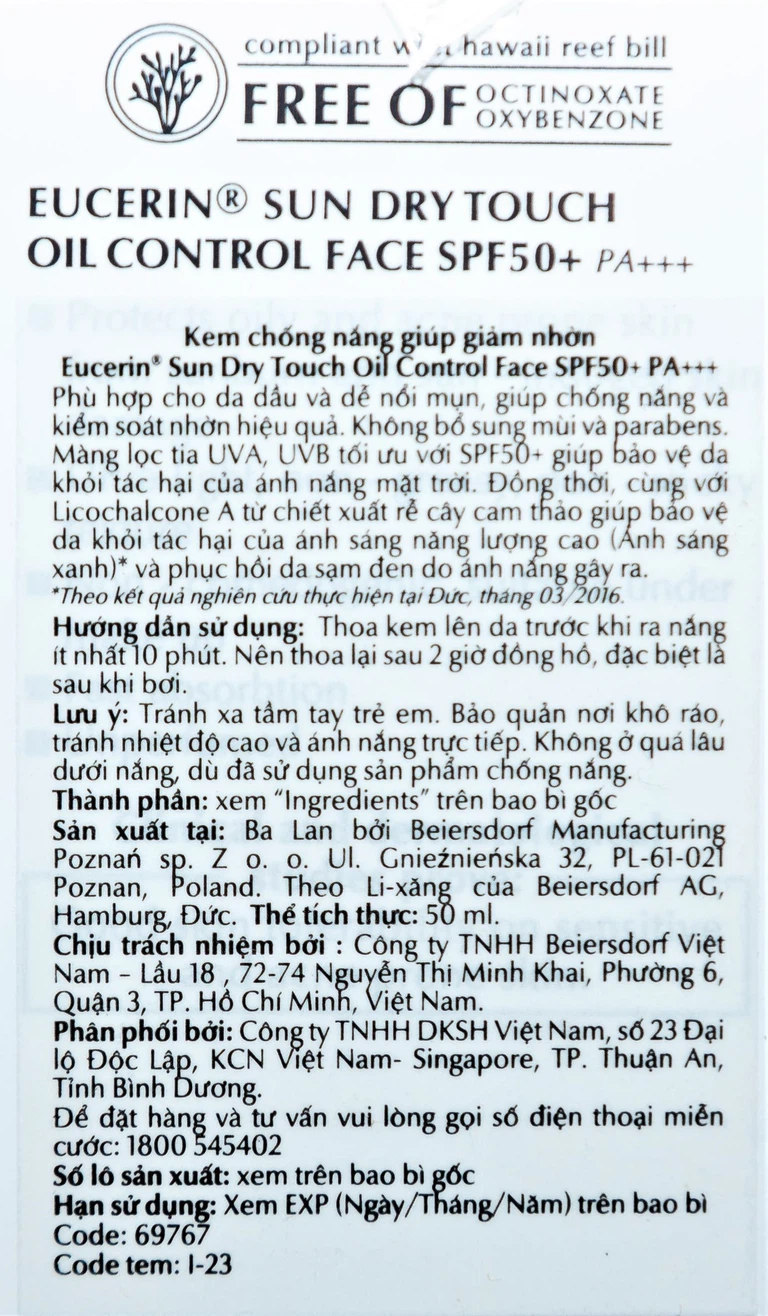 Kem chống nắng Eucerin Sun Dry Touch Oil Control Face SPF50+ PA+++ với màng lọc tia UVA, UVB tối đa cùng SPF50+ giúp bảo vệ da tối ưu ngăn ngừa các tác hại của ánh nắng mặt trời. Sản phẩm đặc biệt phù hợp để kiểm soát nhờn dành cho da nhờn mụn. Không bổ sung mùi và parabens.