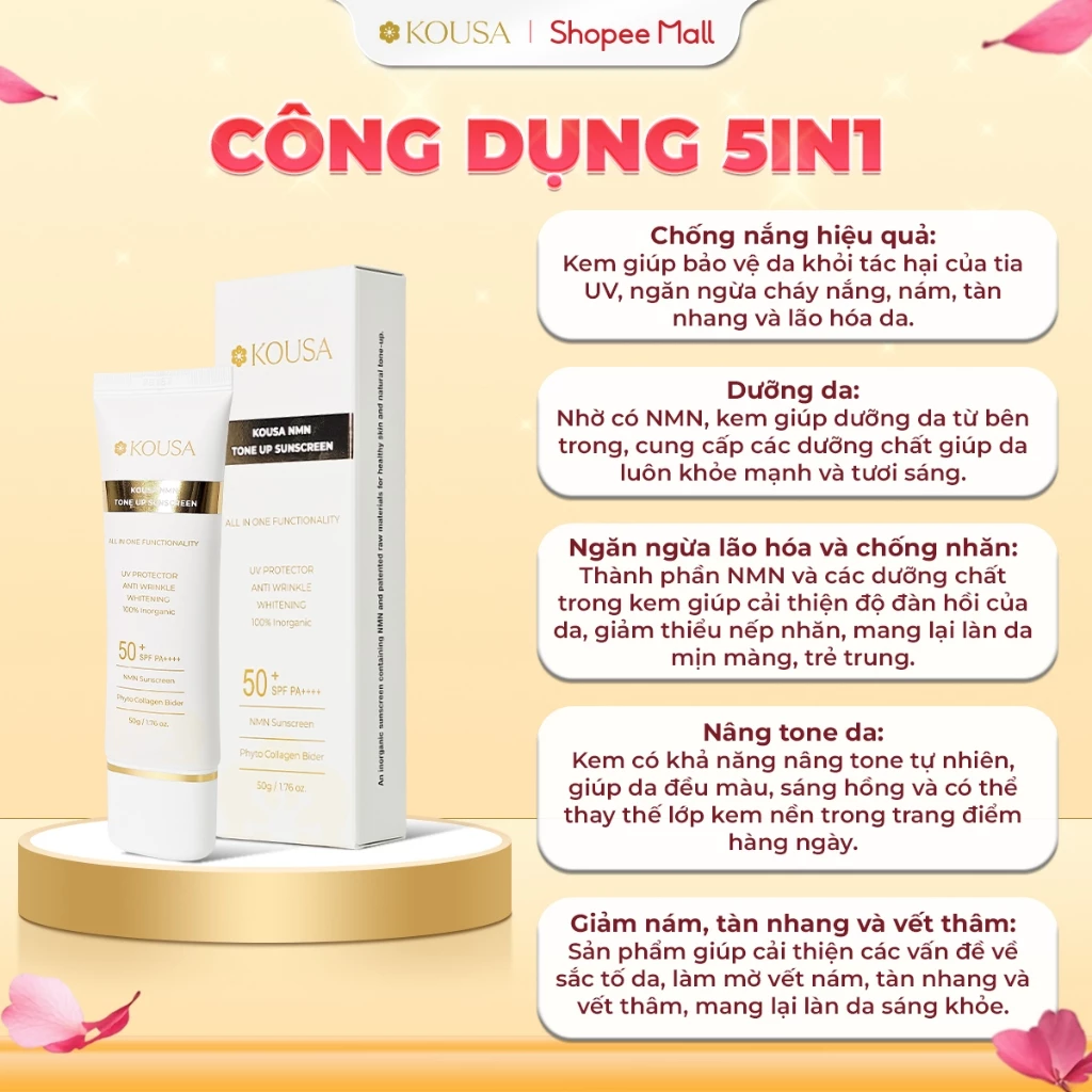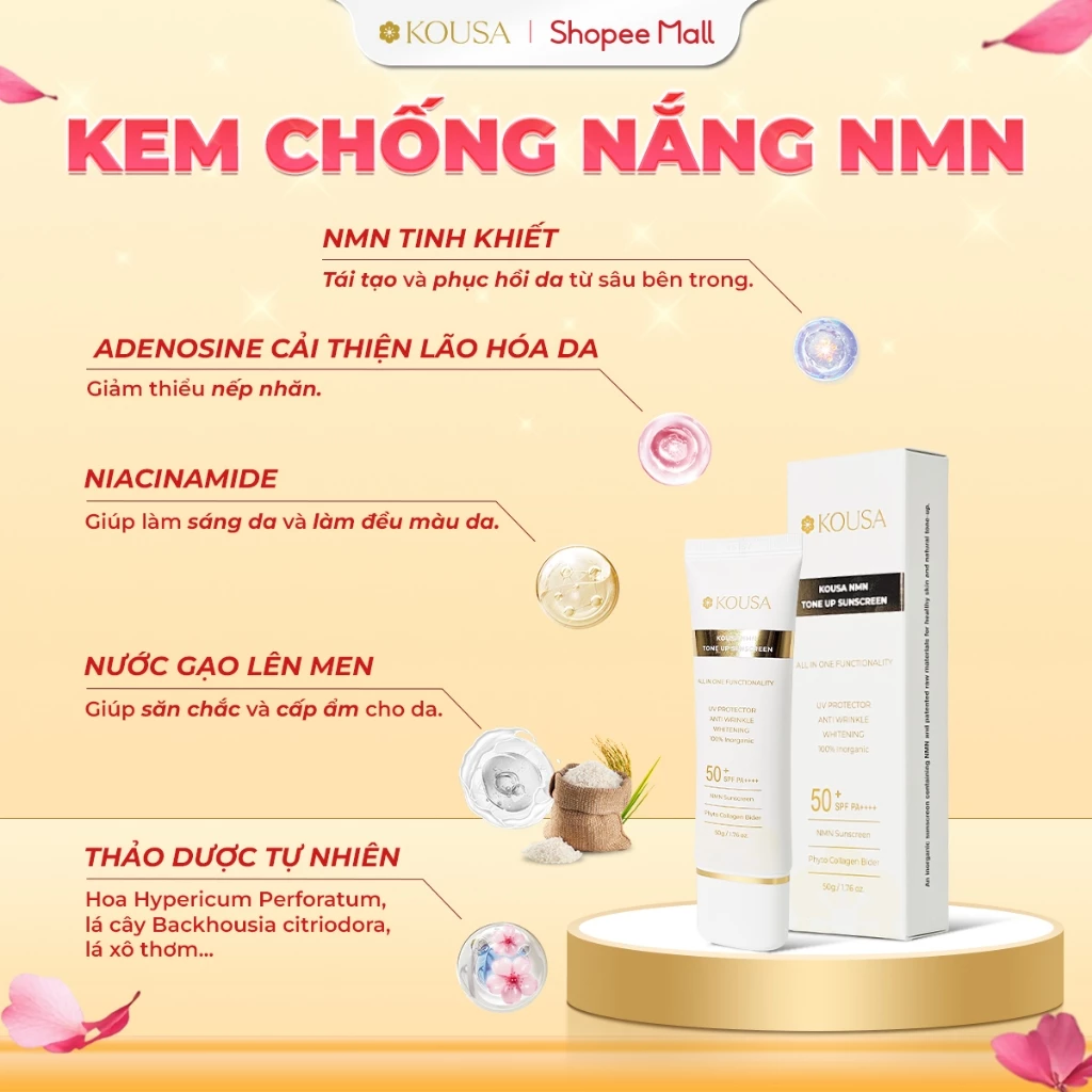 Kousa NMN Suncream là kem chống nắng vật lý (vô cơ) thế hệ mới đến từ thương hiệu KOUSA, Hàn Quốc. Sản phẩm áp dụng màng lọc Zinc Oxide với chỉ số SPF 50+ PA++++ đã được kiểm nghiệm, giúp tạo ra một lớp màng bảo vệ da phổ rộng, phản xạ hiệu quả tia UVA và UVB.