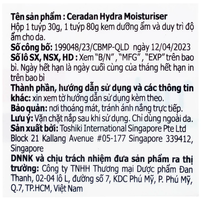 Thành phần của Kem dưỡng ẩm Ceradan Hydra