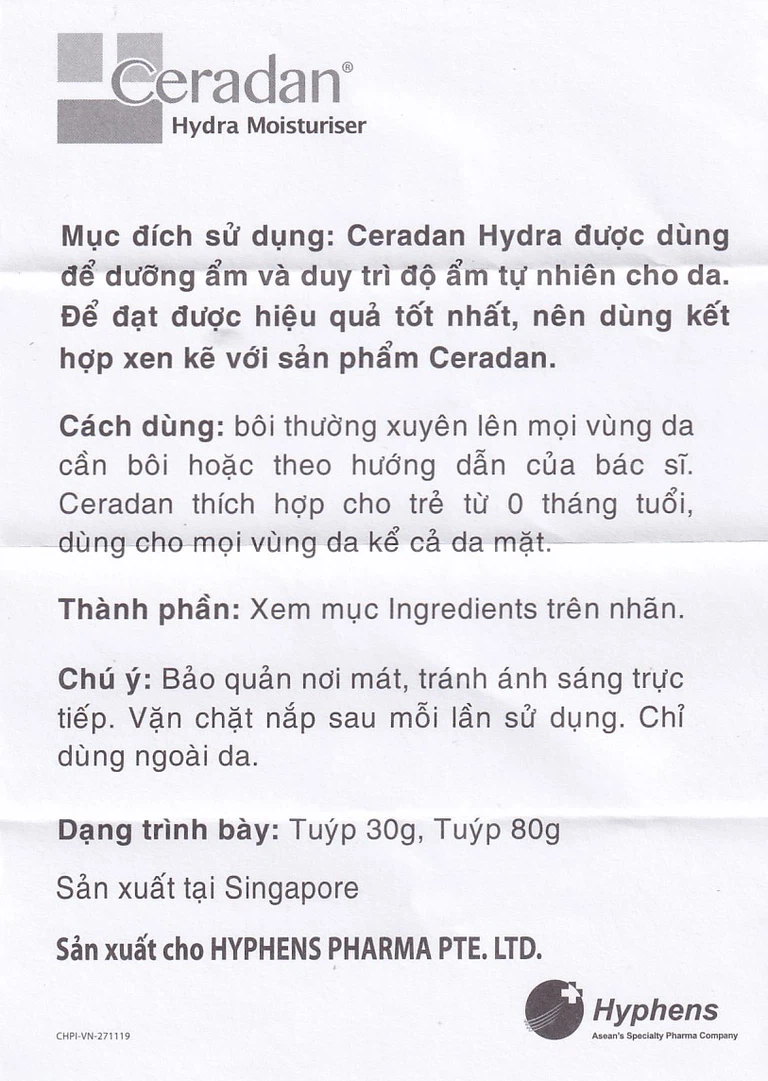 Ceradan Hydra Moisturiser là kem dưỡng ẩm của thương hiệu Hyphens Pharma xuất xứ từ Singapore có tác dụng kích thích phục hồi hàng rào bảo vệ da. Nổi bật với Ceramide giúp ổn định hàng rào bảo vệ da, hyaluronate và glycerin tăng cường độ ẩm cho da, Ceradan Hydra Moisturiser chính là trợ thủ hoàn hảo nuôi dưỡng làn da khô nhạy cảm. Sản phẩm nhẹ dịu, lành tính, sử dụng được cho trẻ từ 0 tháng tuổi và người lớn.
