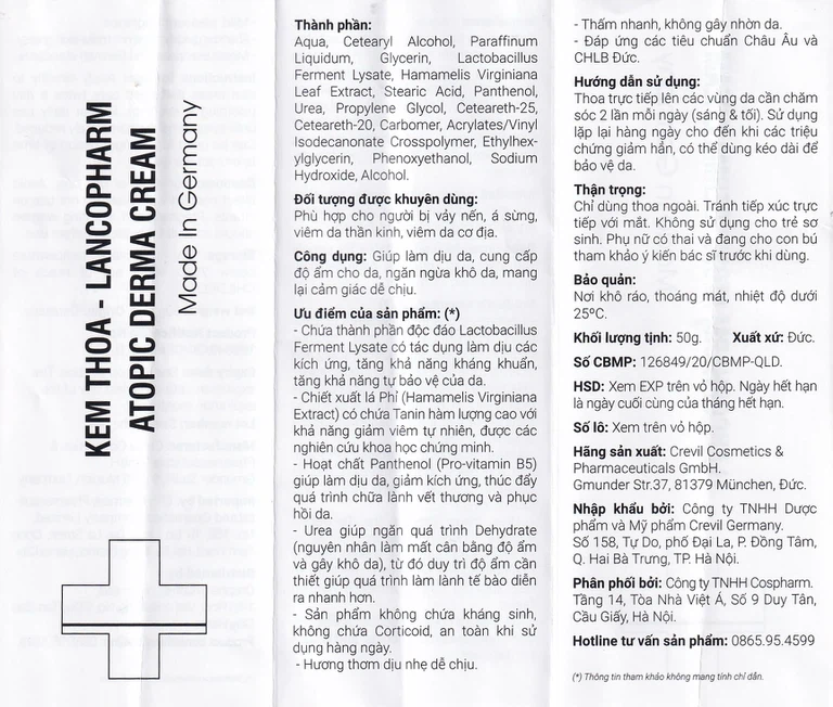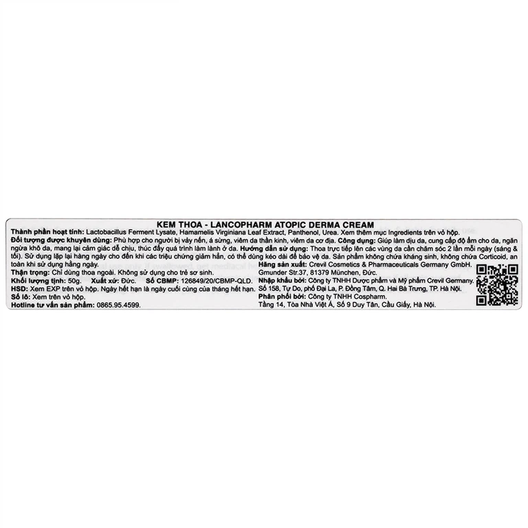 Thành phần của Kem thoa Lancopharm Atopic Derma Cream 50g
