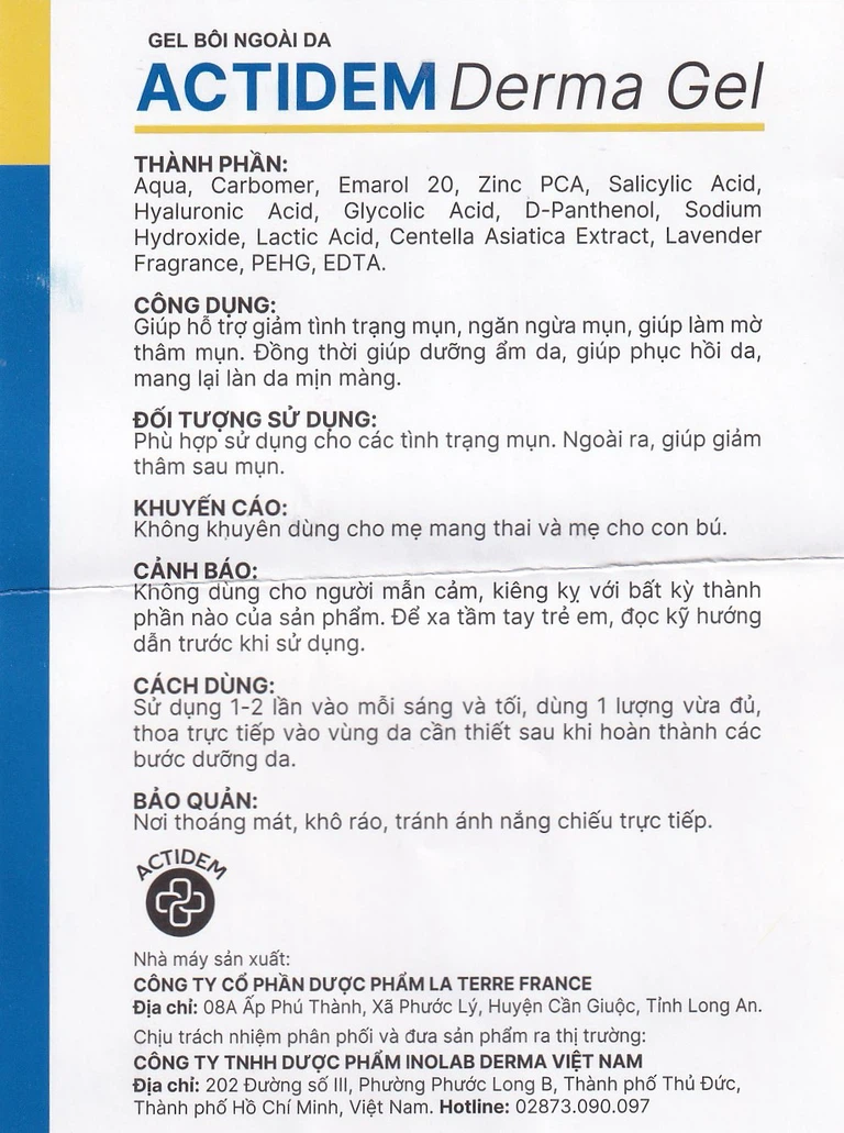 Actidem Derma Gel là dòng sản phẩm chăm sóc da với công năng giúp hỗ trợ giảm tình trạng mụn, ngăn ngừa mụn, giúp làm mờ thâm mụn. Đồng thời giúp dưỡng ẩm da, giúp phục hồi da, mang lại làn da mịn màng.