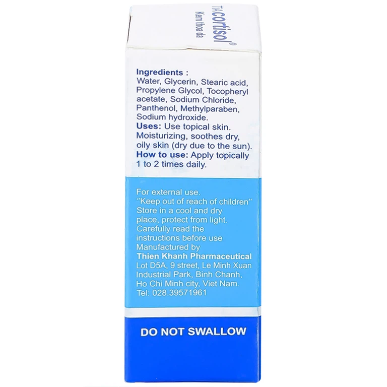 Kem thoa da Tiacortisol là sản phẩm dùng thoa da tại chỗ. Sản phẩm giúp dưỡng ẩm, làm mềm dịu vùng da bị khô, nhờn (do mất nước, khô do nắng).