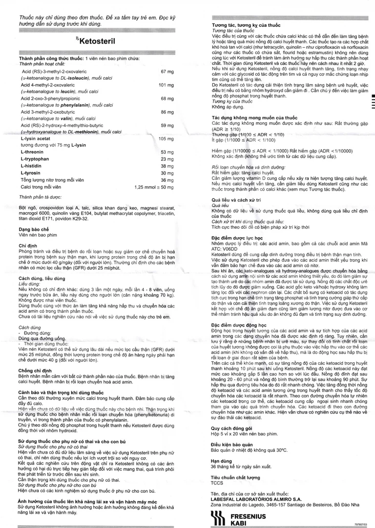 Thời gian dùng thuốc: Viên nén Ketosteril có thể sử dụng lâu dài nếu mức lọc cầu thận (GFR) dưới mức 25 ml/phút, đồng thời lượng protein trong chế độ ăn hàng ngày phải hạn chế dưới mức 40 g (đối với người lớn).