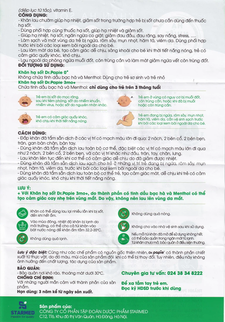 Khăn hạ sốt Dr.Papie 3mo+ và khăn hạ sốt Dr Papie 0+ là sản phẩm của Công ty Cổ phần Tập đoàn Dược phẩm Starmed – Tổ chức Dược phẩm tiên phong cung cấp các sản phẩm bảo vệ sức khỏe cho bé ngay từ khi chào đời.