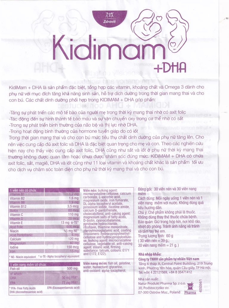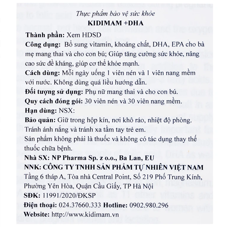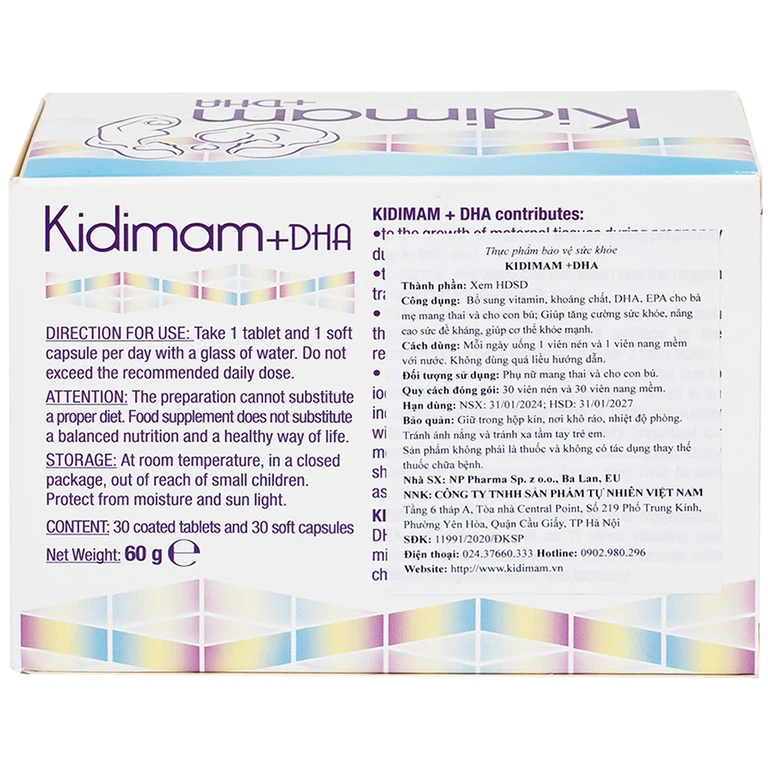 Kidimam + DHA bổ sung vitamin, khoáng chất , DHA, EPA cho bà mẹ mang thai và cho con bú; Giúp tăng cường sức khỏe, nâng cao sức đề kháng, giúp cơ thể khỏe mạnh.