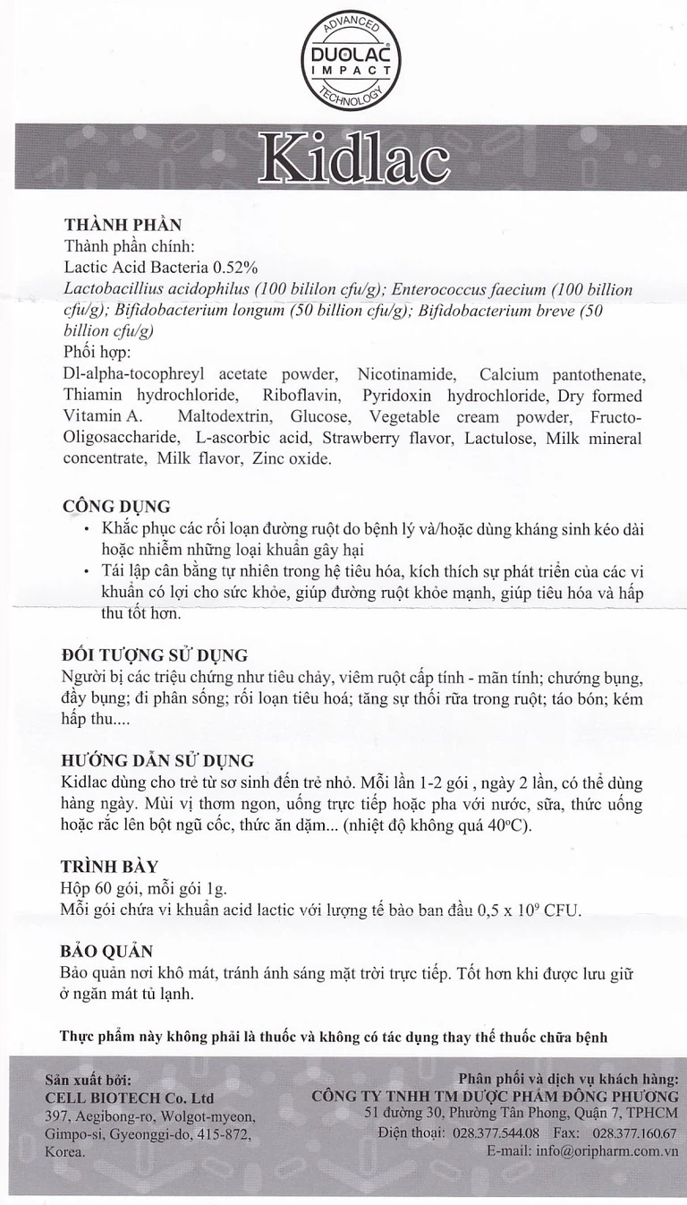 Men vi sinh Kidlac chứa 4 chủng vi khuẩn của acid lactic kết hợp với công nghệ bao kép Duolac. Sản phẩm giúp tái lập cân bằng tự nhiên trong hệ tiêu hóa, kích thích sự phát triển của các vi khuẩn có lợi cho sức khỏe, hỗ trợ điều trị các rối loạn đường ruột do bệnh lý hoặc dùng kháng sinh kéo dài hiệu quả.