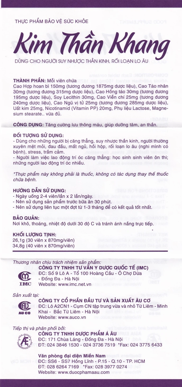 Viên uống Kim Thần Khang Á Âu tăng cường lưu thông máu, giúp dưỡng tâm, an thần (3 vỉ x 10 viên)