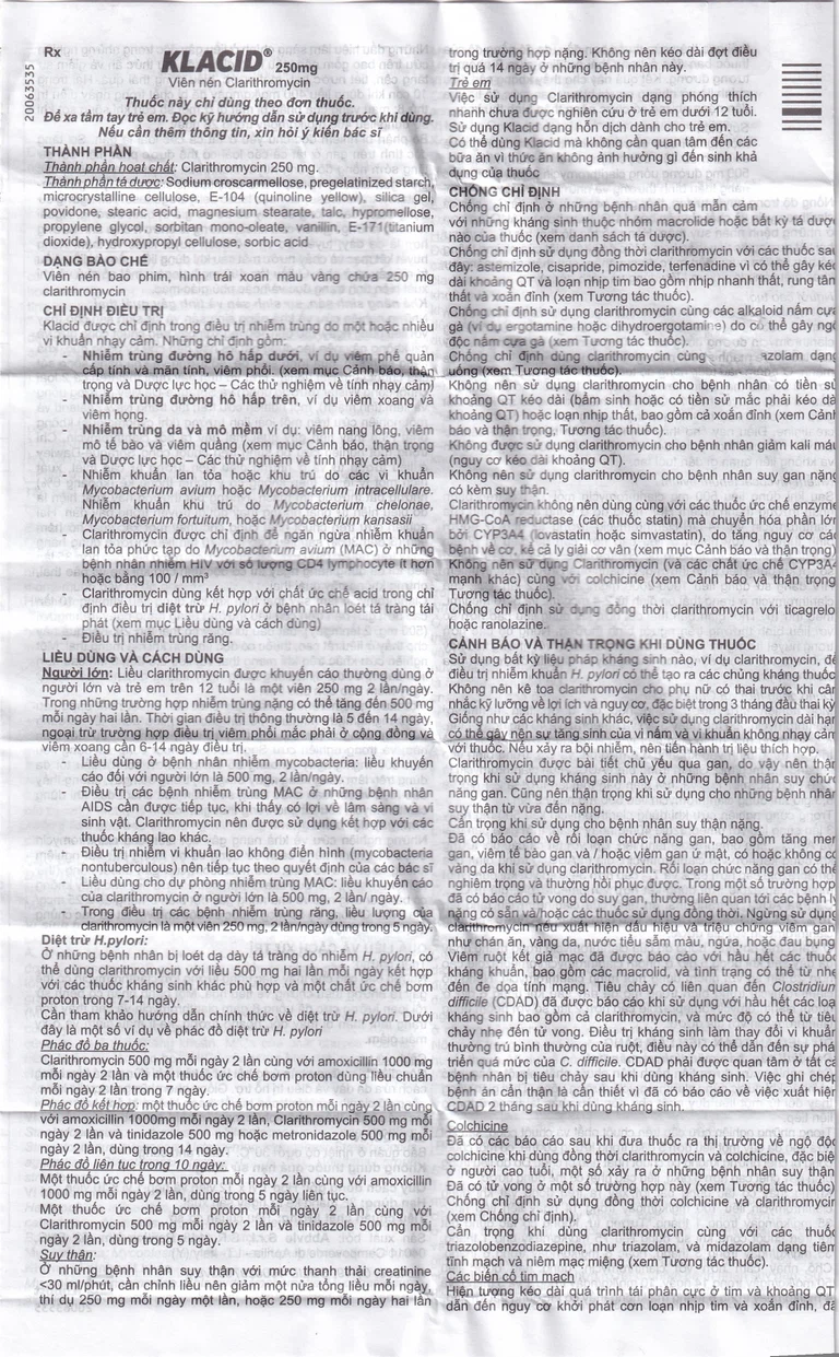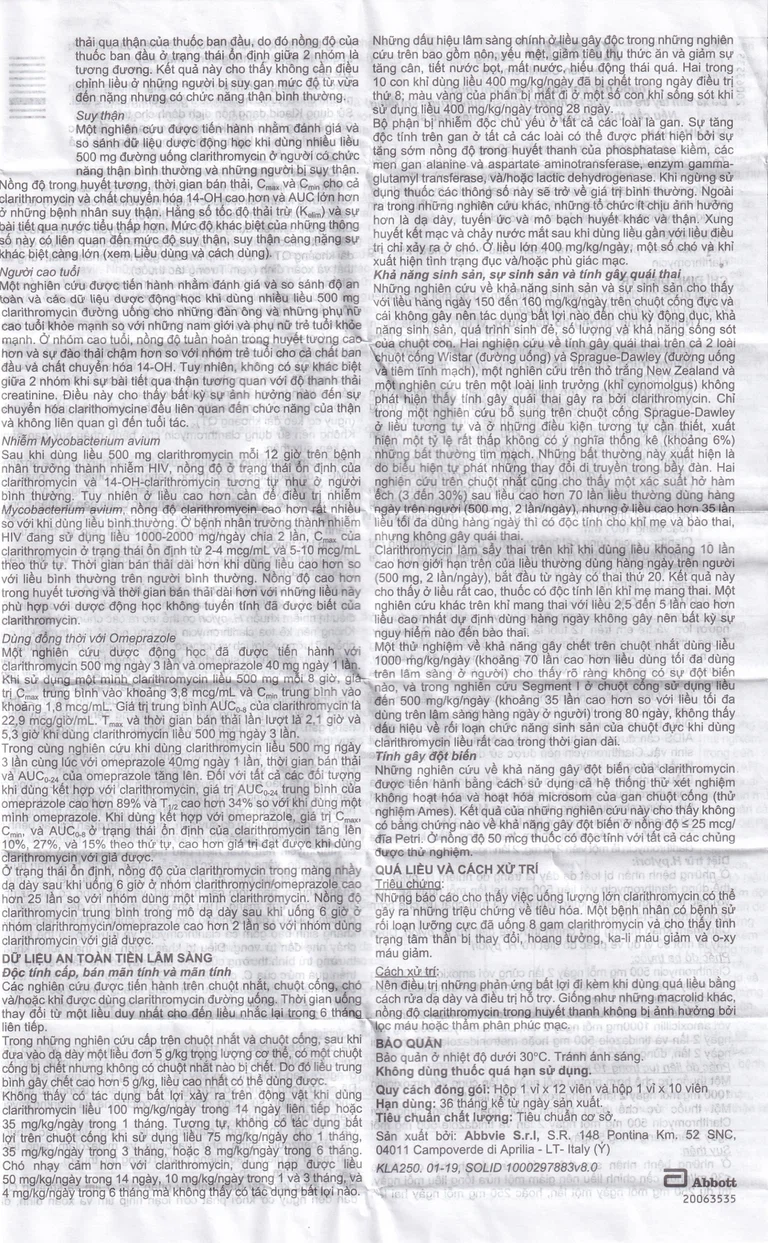 - Clarithromycin dùng kết hợp với chất ức chế acid trong chỉ định điều trị diệt trừ H.pylori ở bệnh nhân loét tá tràng tái phát (xem mục Liều dùng và cách dùng).