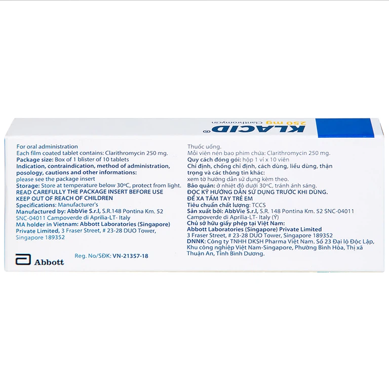 Việc sử dụng Clarithromycin dạng phóng thích nhanh chưa được nghiên cứu ở trẻ em dưới 12 tuổi. Sử dụng Klacid dạng hỗn dịch dành cho trẻ em. Có thể dùng Klacid mà không cần quan tâm đến các bữa ăn vì thức ăn không ảnh hưởng gì đến sinh khả dụng của thuốc.