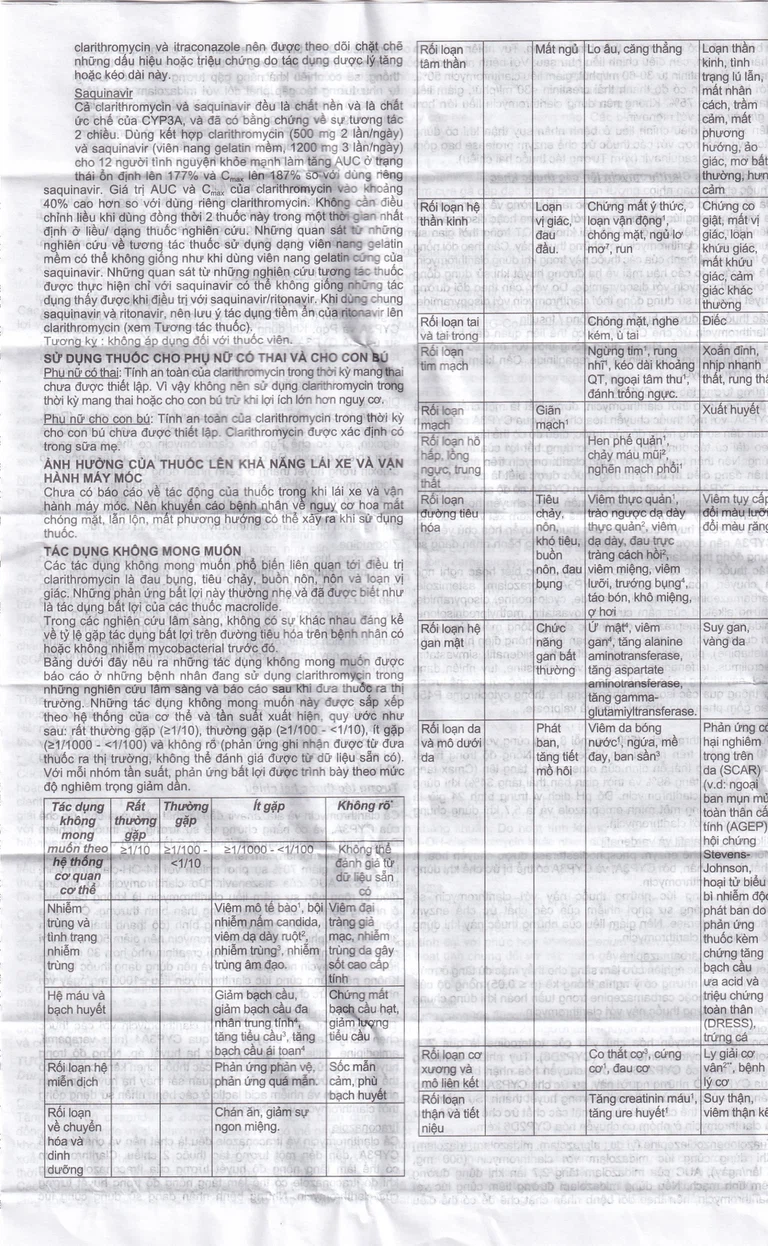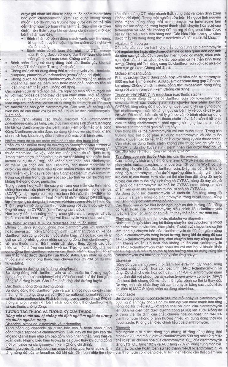 - Chống chỉ định sử dụng Clarithromycin với bất kỳ thuốc nào sau đây: Cisaprid, Pimozide và Terfenadine. Nồng độ Cisapid, Pimozide và Terfenadine tăng đã được báo cáo ở những bệnh nhân dùng đồng thời cả hai loại những thuốc này và Clarithromycin. Điều này có thể gây kéo dài thời gian QT và những rối loạn nhịp kể cả nhịp nhanh thất, rung thất và xoắn đỉnh. Những tác dụng tương tự được ghi nhận khi cho đồng thời Astemizole và những Macrolide khác.