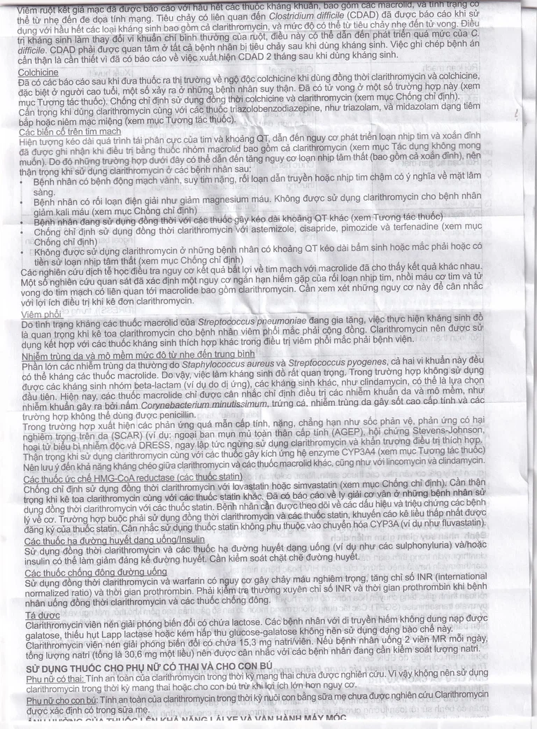Colchicine là chất nền cho cả CYP3A4 và protein vận chuyển P-glycoproteln (Pgp). Clarithromycin và các macrolid khác ức chế CYP3A4 và Pgp. Khi dùng Clarithromycin cùng lúc với colchicine, sự ức chế CYP3A4 và/hay Pgp do Clarithromycin có thể dẫn đến tăng phơi nhiễm với colchicine. Cần kiểm tra bệnh nhân về những triệu chứng lâm sàng do ngộ độc colchicine. Nên giảm liều colchicine khi sử dụng đồng thời với Clarithromycin ở những bệnh nhân có chức năng thận và gan bình thường. Chống chỉ định sử dụng đồng thời Clarithromycin và colchicine ở những bệnh nhân suy thận hoặc suy gan.