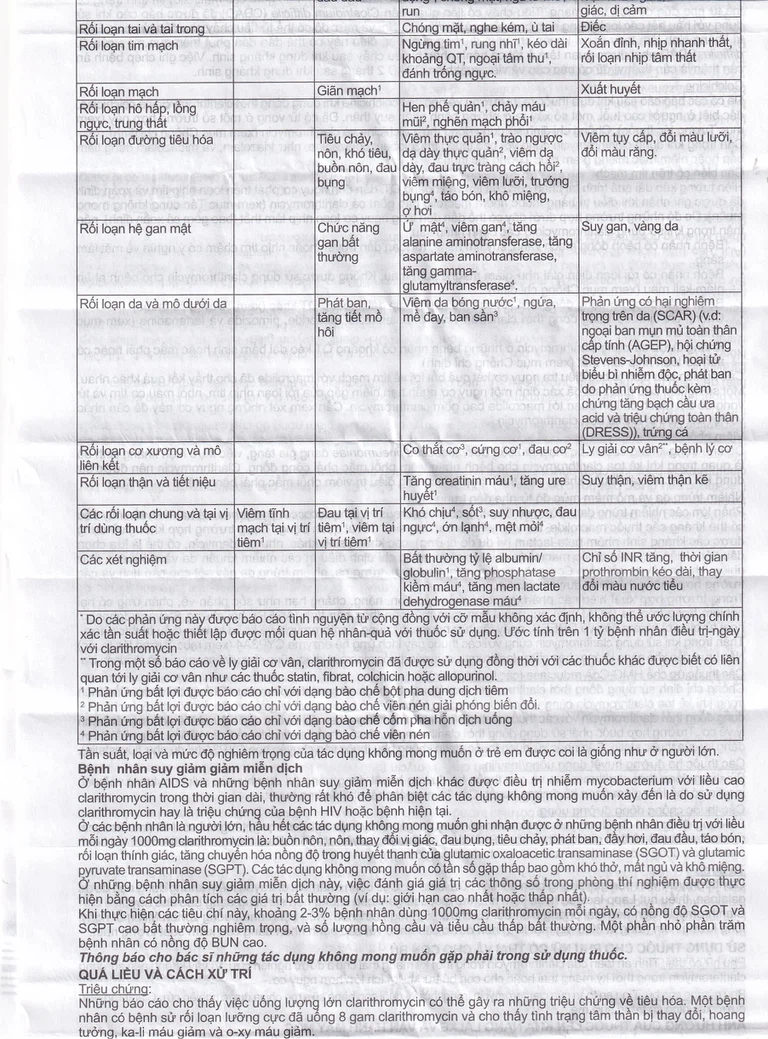 Bảng dưới đây nêu ra những tác dụng bất lợi được báo cáo ở những bệnh nhân đang sử dụng Clarithromycin trong những nghiên cứu lâm sàng và báo cáo sau khi đưa thuốc ra thị trường.