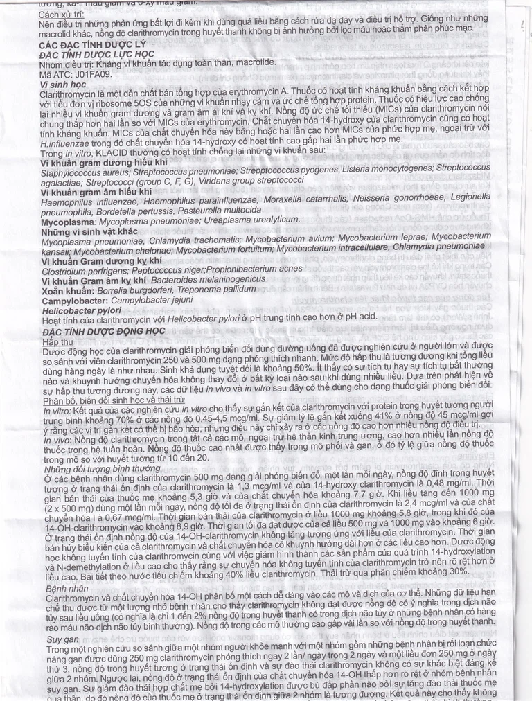 Clarithromycin là một dẫn chất bán tổng hợp của Erythromycin A. Thuốc có hoạt tính kháng khuẩn bằng cách kết hợp với tiểu đơn vị Ribosome 50s của những vi khuẩn nhạy cảm và ức chế tổng hợp protein. Thuốc có hiệu lực cao chống lại nhiều vi khuẩn gram dương và gram âm ái khí và kỵ khí. Nồng độ ức chế tối thiểu (MICs) của Clarithromycin nói chung thấp hơn hai lần so với MICs của erythromycin.