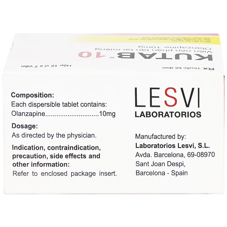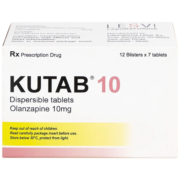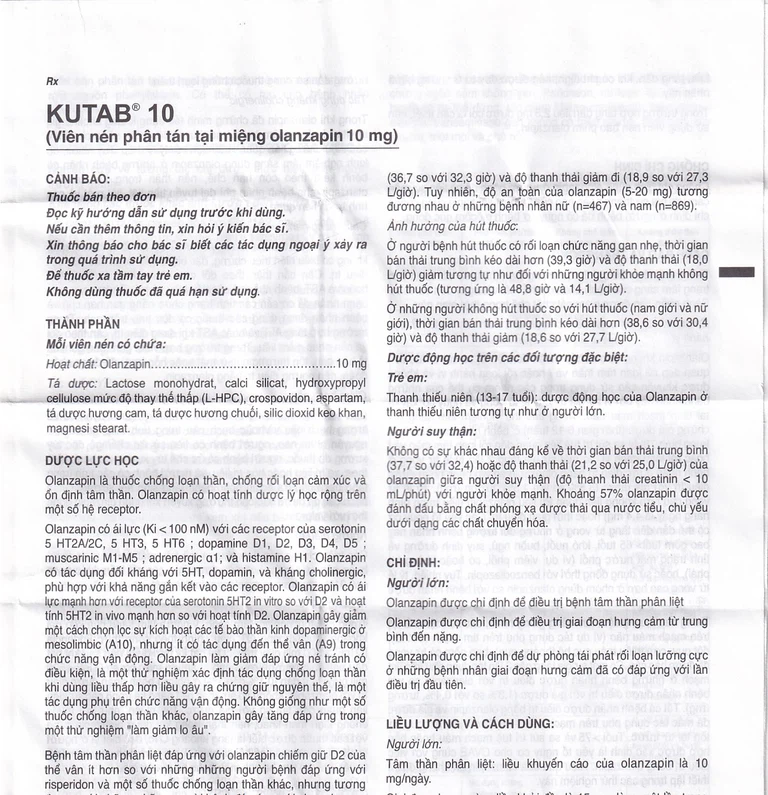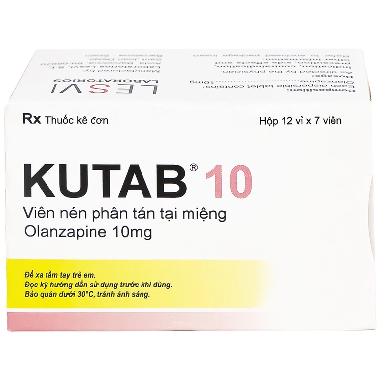 Kutab 10 là viên nén phân tán tại miệng chứa hoạt chất Olanzapine dùng trong điều trị tâm thần phân liệt, điều trị giai đoạn hưng cảm vừa đến nặng và dự phòng tái phát rối loạn lưỡng cực ở những bệnh nhân giai đoạn hưng cảm đã có đáp ứng với lần điều trị đầu tiên.