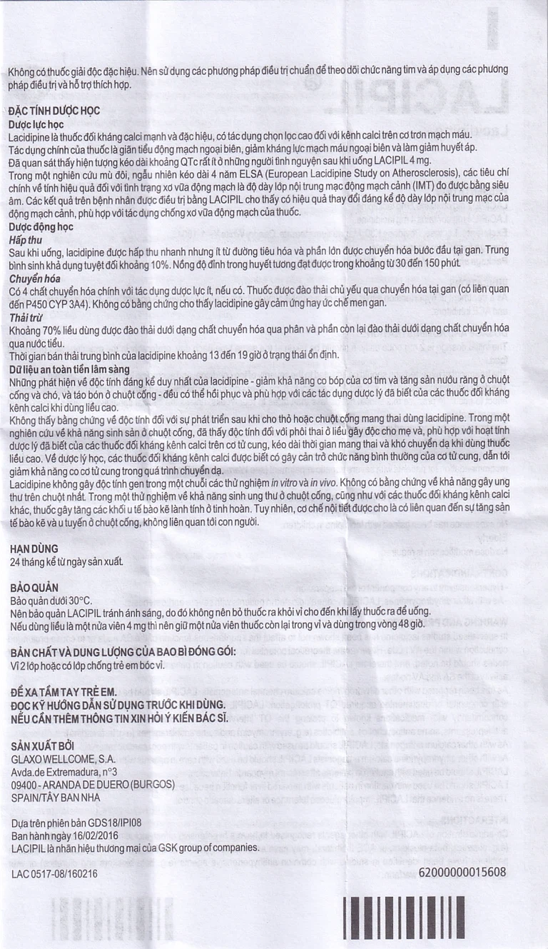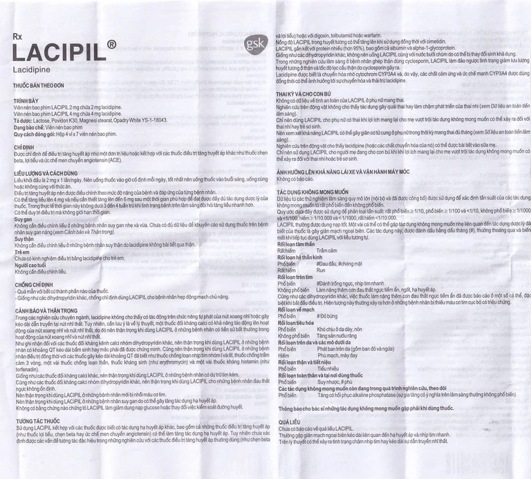 Thuốc Lacipil là sản phẩm của công ty Glaxo Wellcome S.A – Tây Ban Nha, có hoạt chính là lacidipine với hàm lượng 2 mg hoặc 4 mg. Thuốc được dùng trong điều trị tăng huyết áp như một đơn trị liệu hoặc kết hợp với các thuốc điều trị tăng huyết áp khác như thuốc chẹn beta, lợi tiểu và ức chế men chuyển angiotensin (ACE). Thuốc dạng viên nén bao phim, có quy cách đóng gói là hộp 4 vỉ x 7 viên, vỉ 2 lớp hoặc có lớp chống trẻ em bóc vỉ.