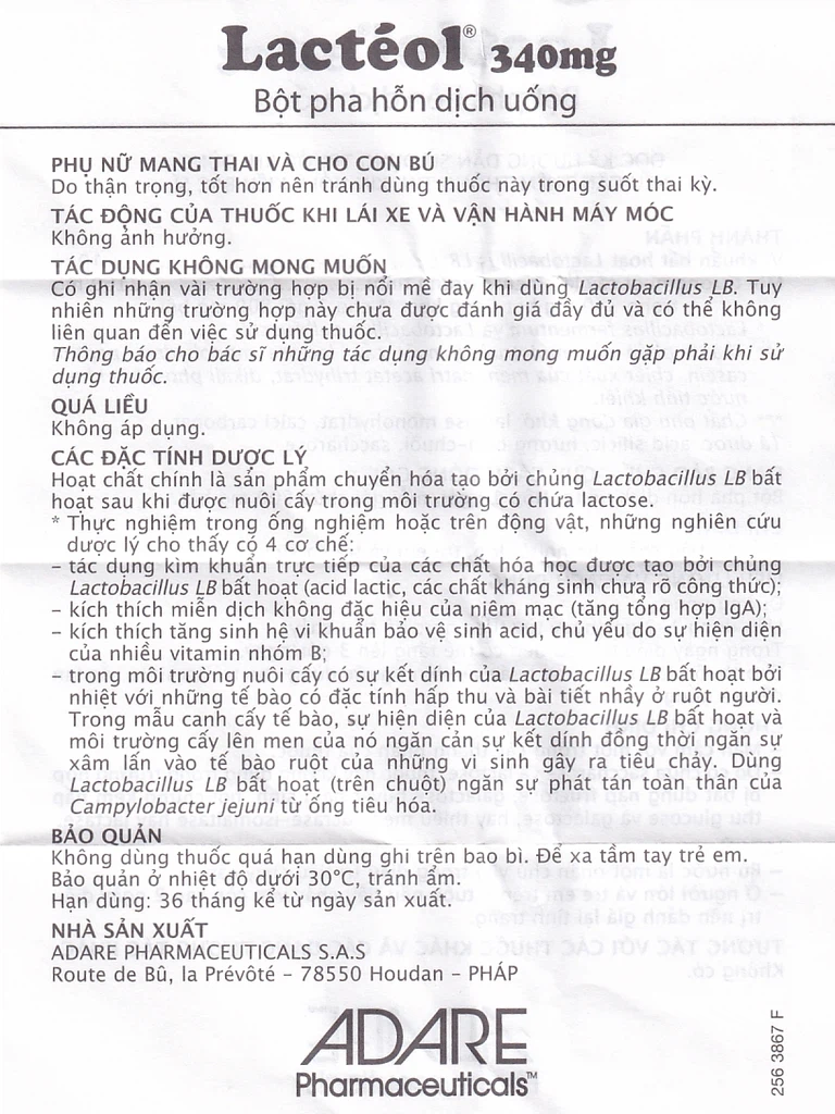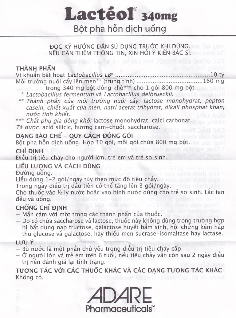 Lacteol 340Mg của công ty Adare Pharmaceuticals S.A.S, thành phần chính chứa Vi khuẩn bất hoạt Lactobacillus LB* 10 tỷ, là thuốc dùng để điều trị tiêu chảy. Lacteol 340Mg được bào chế dưới dạng bột pha hỗn dịch uống, hộp 10 gói, mỗi gói chứa 800 mg bột.