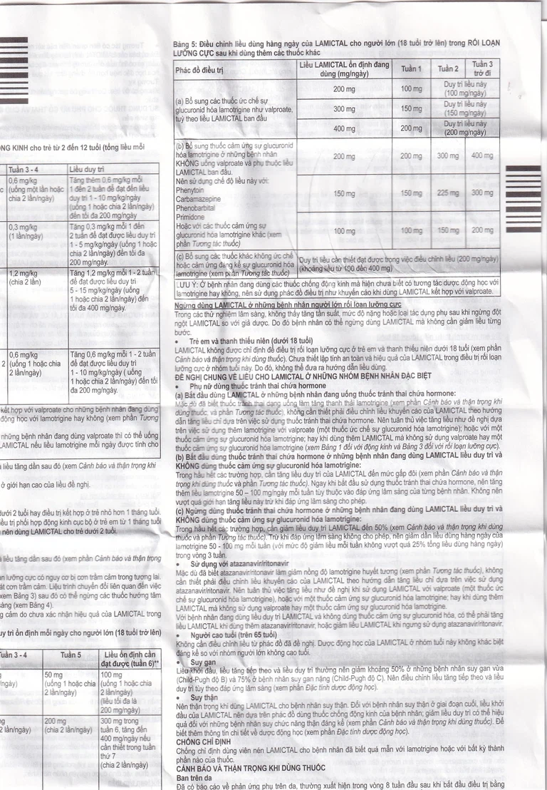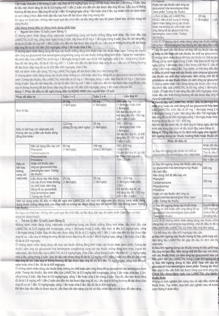 - Nên sử dụng với Phenytoine , carbamazepine, phenobarbital, primidone hoặc với các thuốc cảm ứng sự glucuronid hoá lamotrigine khác: Tuần 1 – 2: 0,6 mg/kg (chia 2 lần). Tuần 3 – 4: 1,2 mg/kg (chia 2 lần). Liều duy trì: tăng thêm 1,2mg/kg mỗi 1 đến 2 tuần để đạt đến liều duy trì 5 – 15mg/kg/ngày (chia 1 hoặc 2 lần) đến tối đa 400 mg/ngày.