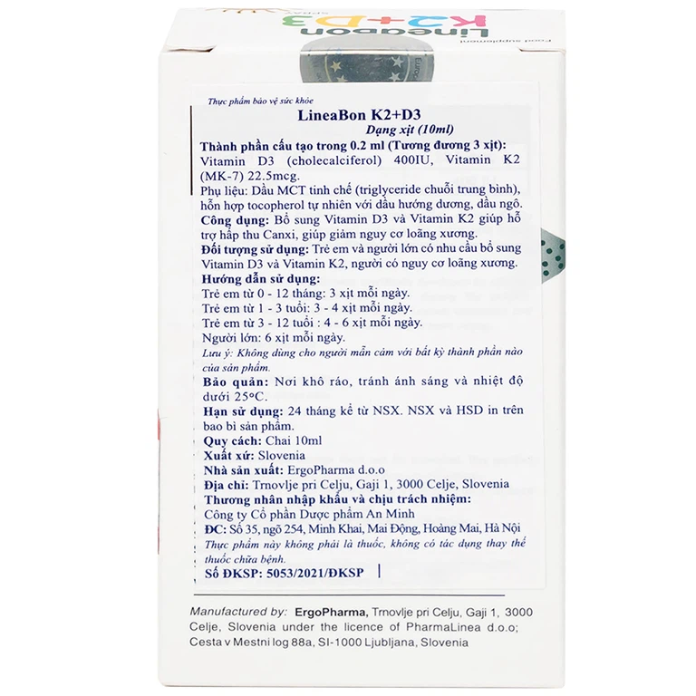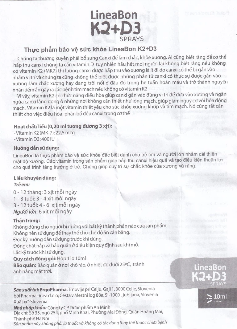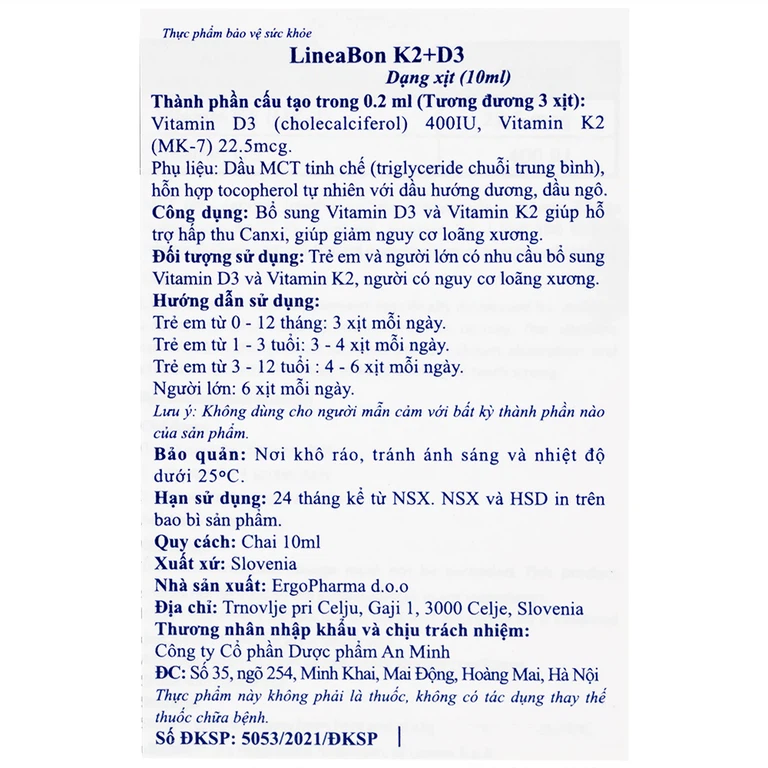 Dung dịch dạng xịt LineaBon K2+D3 10ml bổ sung Vitamin D3 và Vitamin K2, hỗ trợ hấp thu canxi