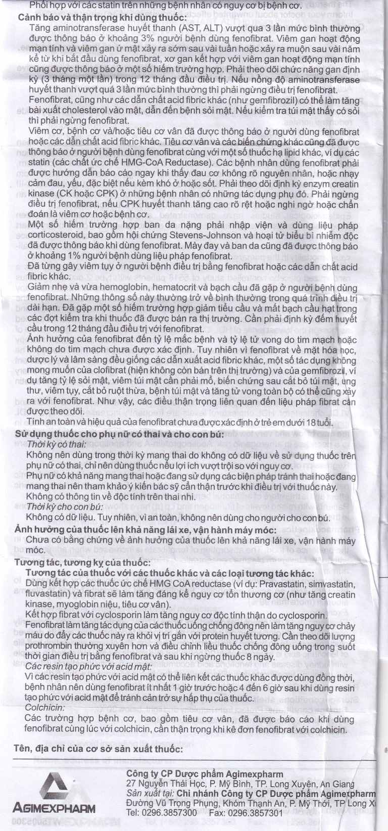 Viêm cơ, bệnh cơ và/hoặc tiêu cơ vân đã được thông báo ở người dùng fenofibrat hoặc các dẫn chất acid fibric khác. Tiêu cơ vân và các biến chứng khác cũng đã được thông báo ở người bệnh dùng fenofibrat cùng với một số thuốc hạ lipid khác, ví dụ các statin (các chất ức chế HMG-CoA Reductase). Các bệnh nhân dùng fenofibrat phải được hướng dẫn báo cáo ngay khi thấy đau cơ không rõ nguyên nhân, hoặc nhạy cảm đau, yếu, đặc biệt nếu kèm khó ở hoặc sốt. Phải theo dõi định kỳ enzym creatin kinase (CK hoặc CPK) ở những bệnh nhân có những tác dụng phụ đó. Phải ngừng điều trị fenofibrat, nếu CPK huyết thanh tăng cao rõ rệt hoặc nghi ngờ hoặc chẩn đoán là viêm cơ hoặc bệnh cơ.