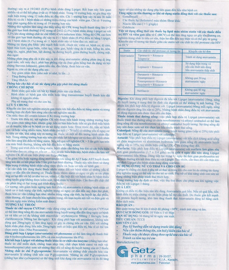 Digoxin: Khi dùng đồng thời nhiều liều atorvastatin và digoxin, nồng độ digoxin trong huyết tương ở trạng thái ổn định tăng khoảng 20%. Bệnh nhân dùng digoxin nên được theo dõi thích hợp.