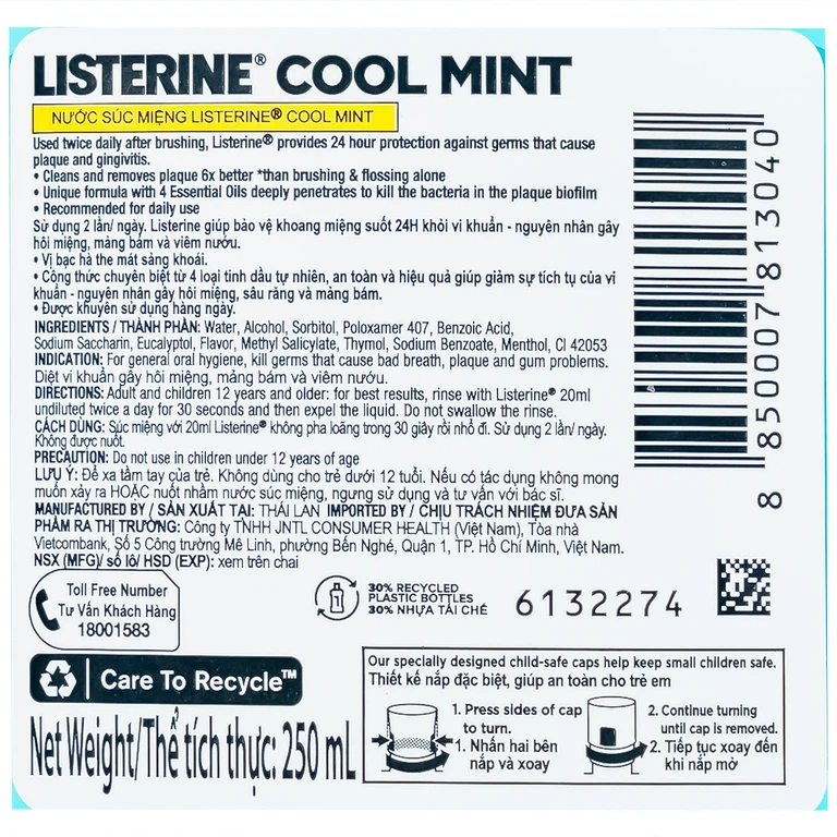 Sử dụng nước súc miệng Listerine Cool Mint hằng ngày là một giải pháp thiết thực để diệt tận gốc nguyên nhân gây mùi khó chịu. Tổng hợp sức mạnh của 4 loại tinh dầu tự nhiên từ Bạc hà, Lộc đề, Xạ hương, Bạch đàn, nước súc miệng Listerine Cool Mint thâm nhập sâu bên trong khoang miệng, “quét sạch” những mảng bám thức ăn cứng đầu ẩn nấp kỹ, giúp diệt 99.9% vi khuẩn chỉ trong 30 giây, bao gồm cả vi khuẩn gây hôi miệng và vi khuẩn gây sâu răng. Công thức độc đáo này hoạt động bằng cách phá vỡ thành tế bào và màng tế bào của vi khuẩn, làm cho các chất bên trong tế bào bị rò rỉ ra ngoài và vi khuẩn sẽ chết.