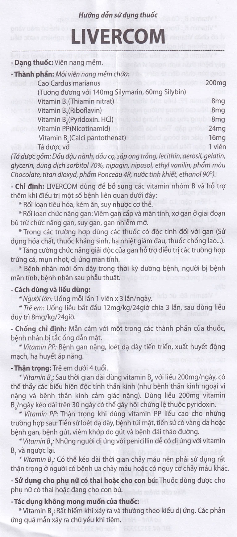 Thuốc Livercom là sản phẩm được sản xuất bởi Công ty Cổ phần Dược phẩm Hà Tây, thuốc được dùng bổ sung vitamin nhóm B và hỗ trợ điều trị rối loạn chức năng gan, giải độc gan… Thuốc Livercom được bào chế dưới dạng viên nang mềm. Quy cách đóng gói: Hộp 12 vỉ x 5 viên.