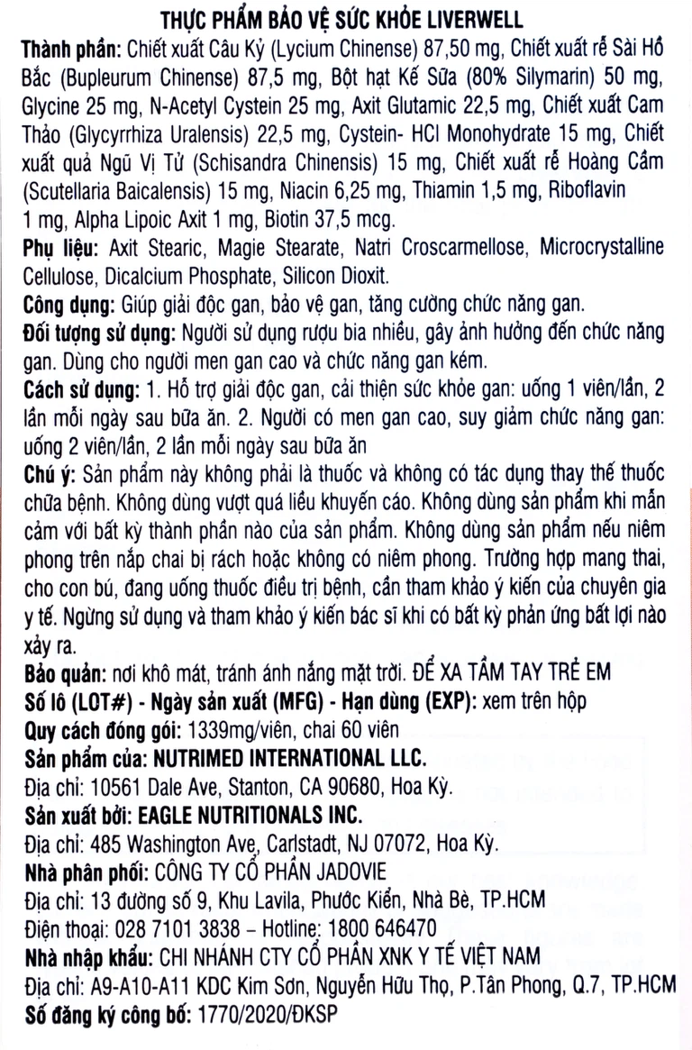 Liverwell Nutrimed giúp giải độc gan, bảo vệ gan, tăng cường chức năng gan.