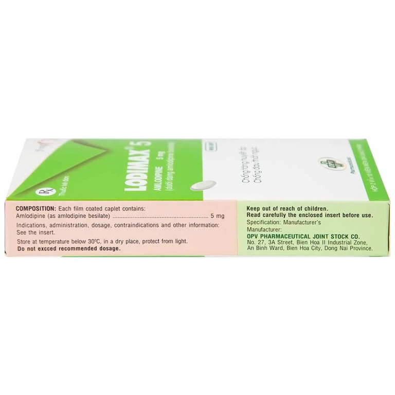 Lodimax 5 được sản xuất bởi Công ty Cổ phần Dược phẩm OPV, với thành phần chính Amlodipine, là thuốc dùng để điều trị tăng huyết áp, đau thắt ngực ổn định mạn tính và đau thắt ngực do co thắt mạch (đau thắt ngực Prinzmetal).