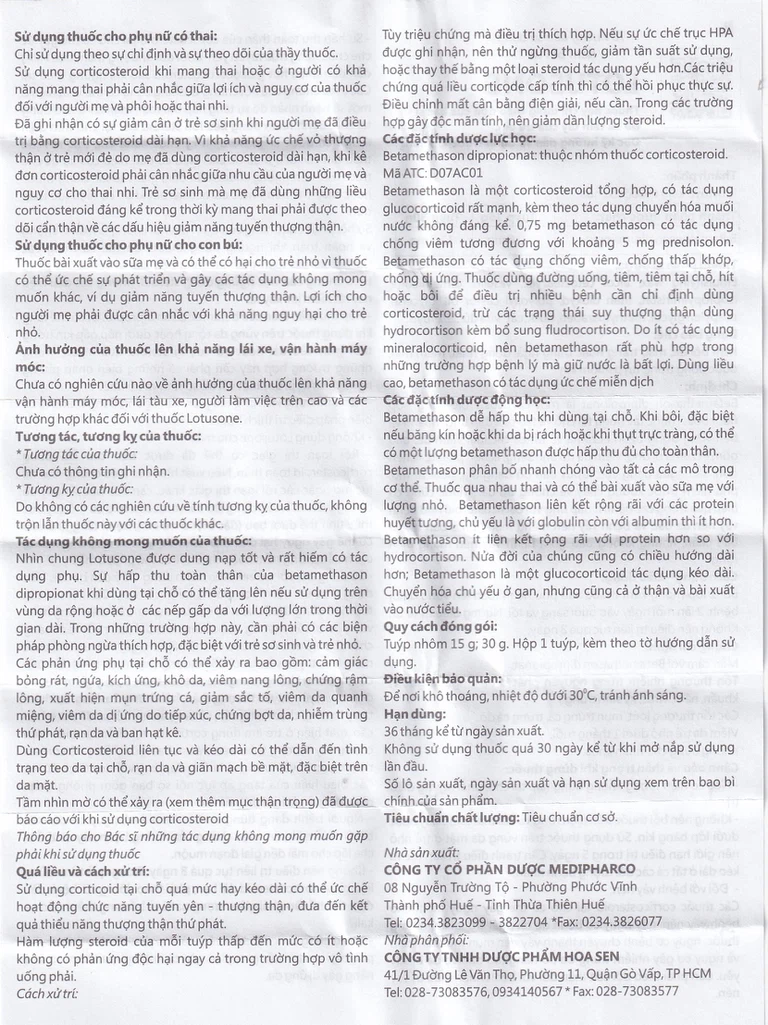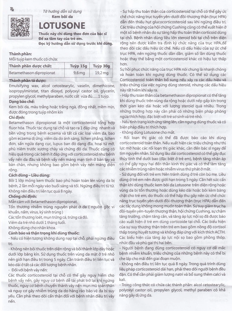 Nhìn chungLotusoneđược dung nạp tốt và rất hiếm có tác dụng phụ. Sự hấp thu toàn thân của betamethason dipropionat khi dùng tại chỗ có thể tăng lên nếu sử dụng trên vùng da rộng hoặc ở các nếp gấp da với lượng lớn trong thời gian dài. Trong những trường hợp này, cần phải có các biện pháp phòng ngừa thích hợp, đặc biệt với trẻ sơ sinh và trẻ nhỏ.