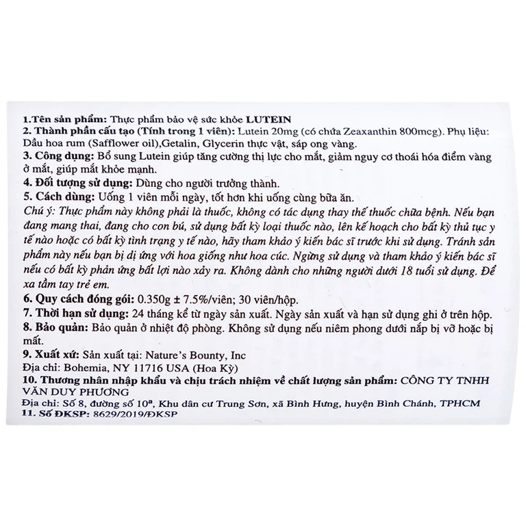 Lutein Nature’s Bounty có chứa thành phần chính lutein , hỗ trợ làm tăng mật độ quang học của các sắc tố võng mạc trong mắt. Giúp bảo vệ đôi mắt tối đa, tạo lớp màn bảo vệ ngăn các tia cực tím, ánh sáng xanh và vi khuẩn gây hại.