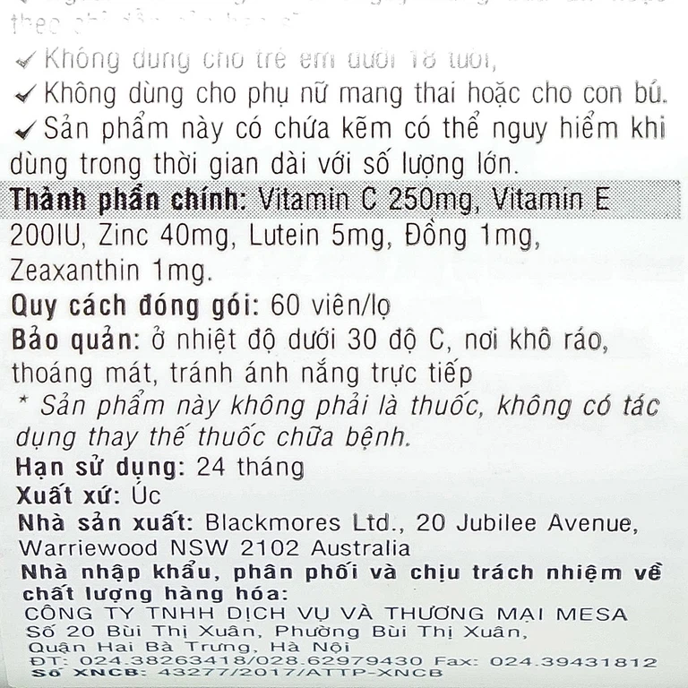 Thành phần của Viên uống Blackmores Macu-Vision Plus