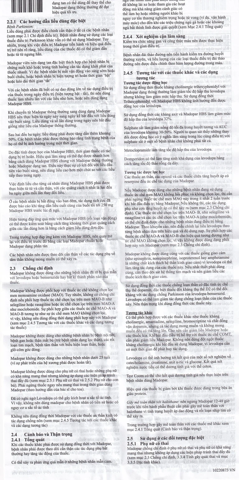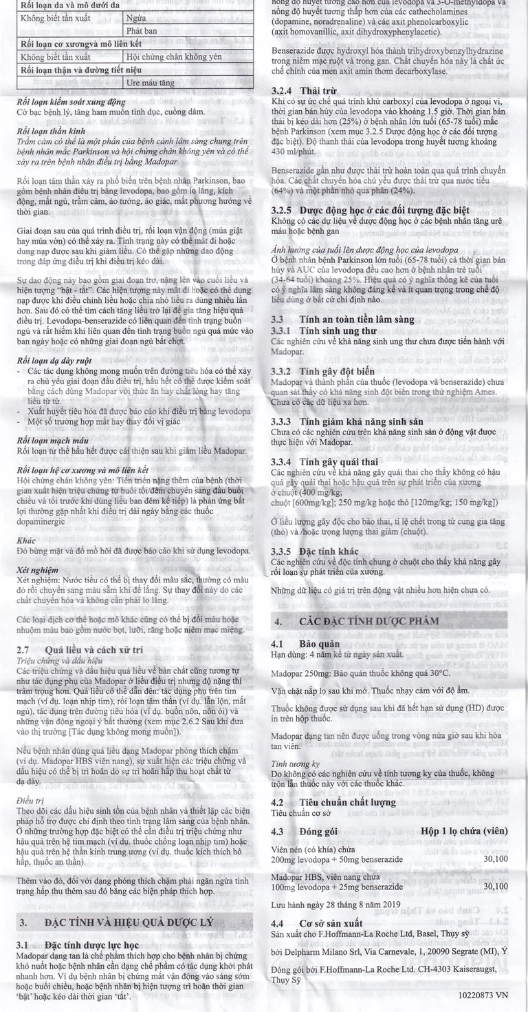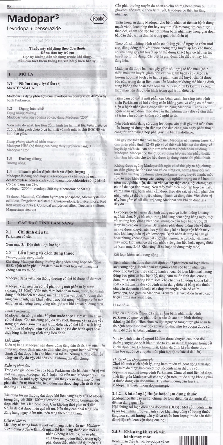Madopar 250mg của Nhà sản xuất F.Hoffmann-La Roche Ltd, thành phần chính levodopa 200mg, benserazide HCl 50mg, là thuốc dùng để điều trị bệnh Parkinson. Madopar dạng tan là chế phẩm thích hợp cho bệnh nhân bị chứng khó nuốt hoặc bệnh nhân cần dạng chế phẩm có tác dụng khởi phát nhanh hơn. Ví dụ bệnh nhân bị chứng mất vận động vào sáng sớm hoặc buổi chiều, hoặc bệnh nhân bị hiện tượng trì hoãn thời gian ‘bật’ hoặc kéo dài thời gian ‘tắt’.