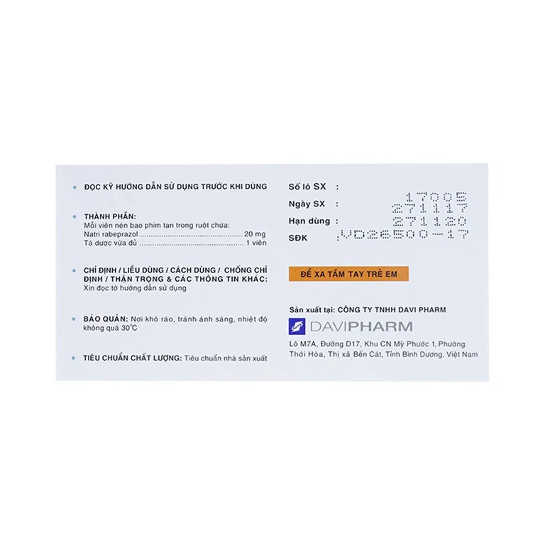 Viên nén bao phim tan trong ruột rabeprazol nên được nuốt nguyên viên. Không được nhai, nghiền hoặc bẻ viên thuốc.