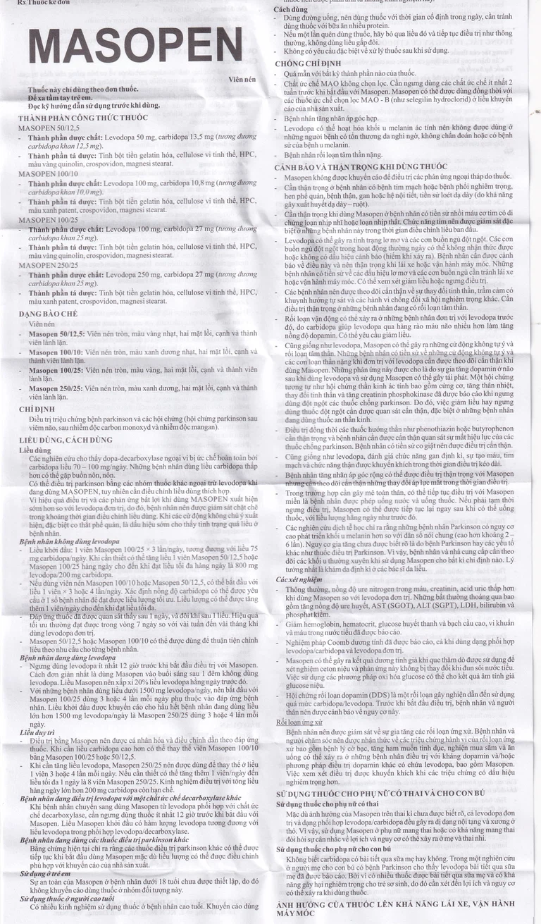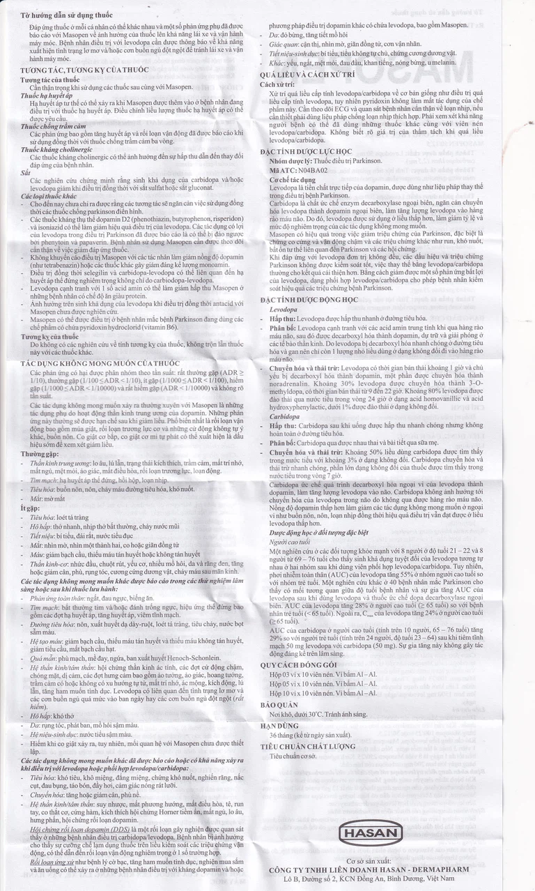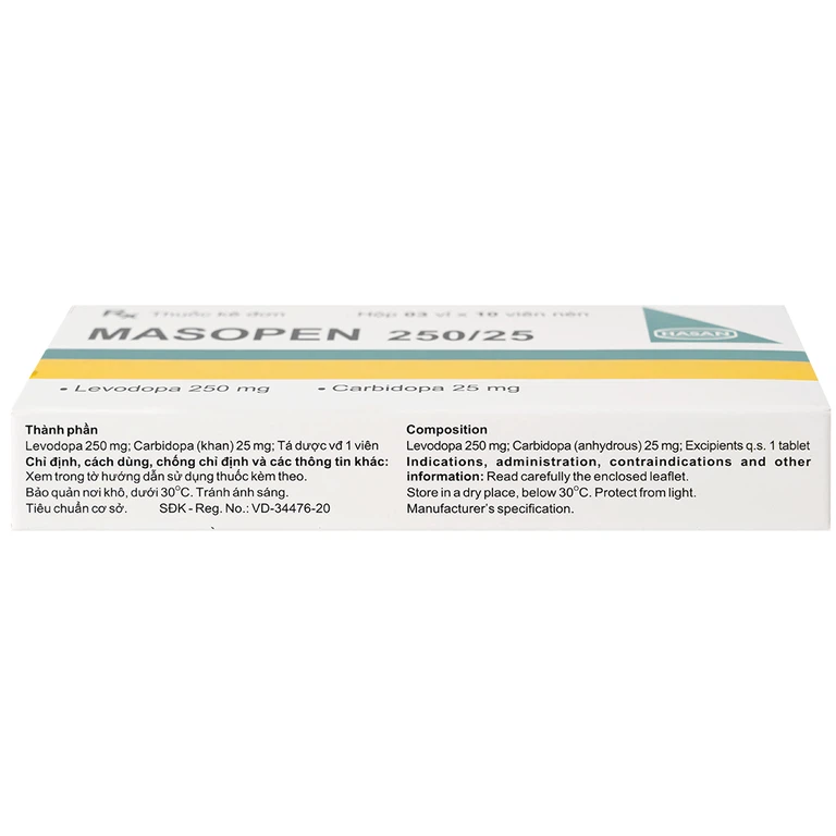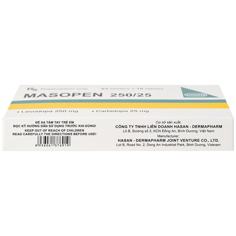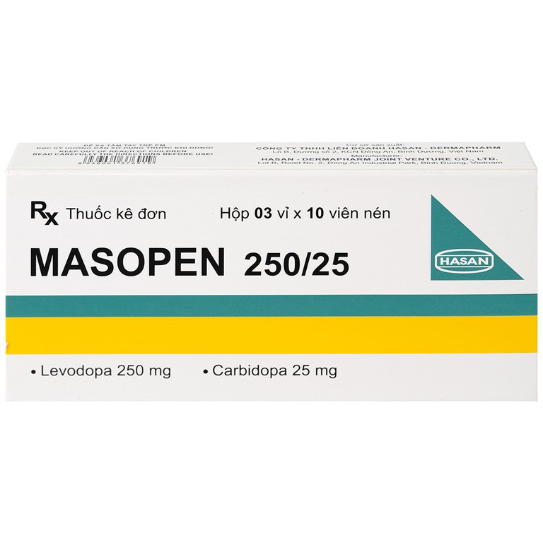 Thuốc Masopen 250/25 của Hasan, có thành phần chính là Levodopa, Carbidopa. Đây là thuốc được dùng điều trị triệu chứng bệnh parkinson và các hội chứng (hội chứng parkinson sau viêm não, sau nhiễm độc carbon monoxyd và nhiễm độc mangan).