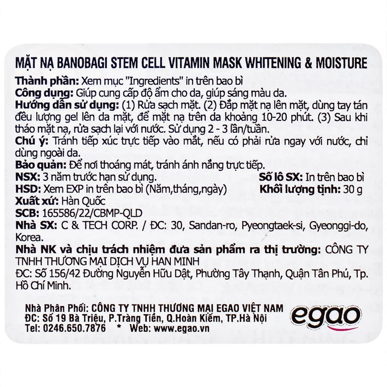 Mặt nạ Banobagi Stem Cell Vitamin Mask Whitening And Moisture hỗ trợ cấp ẩm và dưỡng sáng da (30g)