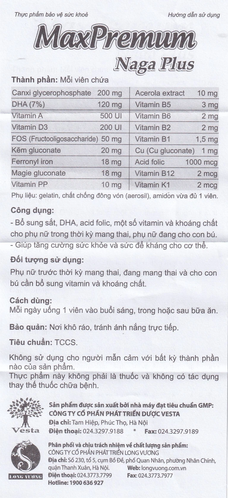 MaxPremum Naga Plus bổ sung sắt, DHA, acid folic, một số vitamin và khoáng chất cho phụ nữ trong thời kỳ mang thai, phụ nữ đang cho con bú. Giúp tăng cường sức khỏe và sức đề kháng cho cơ thể.